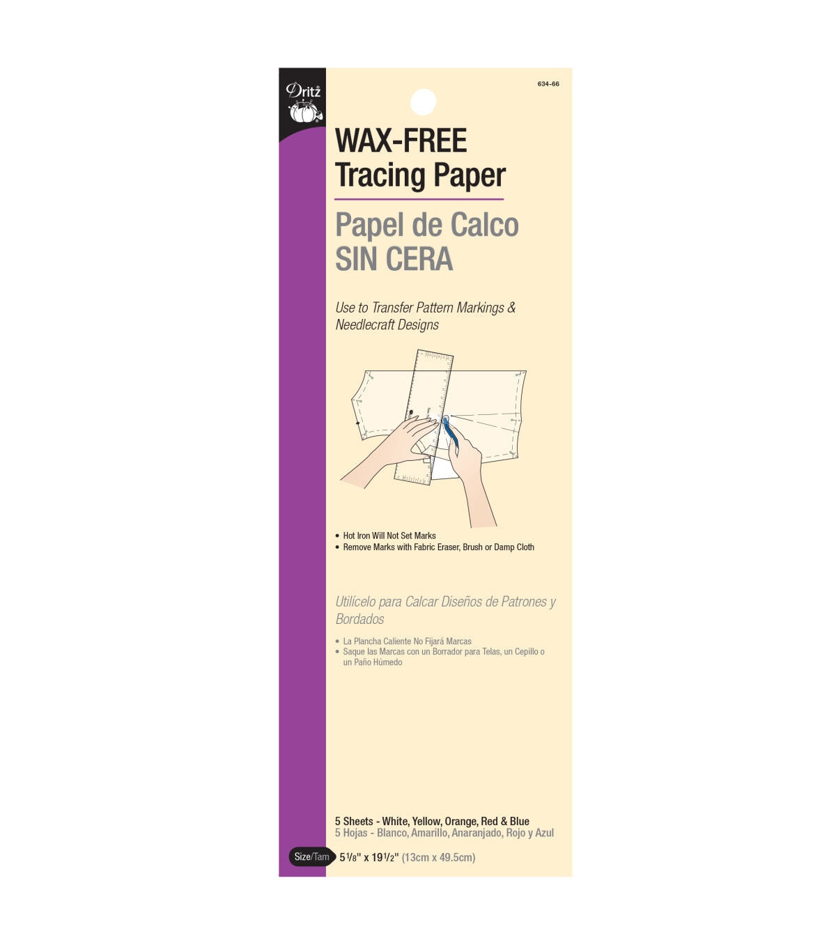 Create perfect patterns on your fabrics with the Dritz Single Face Wax-free Tracing Paper - Assorted. This pack contains five 6 x 19-inch single-face tracing papers in white, yellow, orange, red and blue shades. These wax-free tracing papers are safe to use on the fabric's right side and allow you to trace patterns on a single sheet of paper. They are also suitable for use on wood, glass, paper and metal. Use them to ink and paint transfer lines without any bleeding.