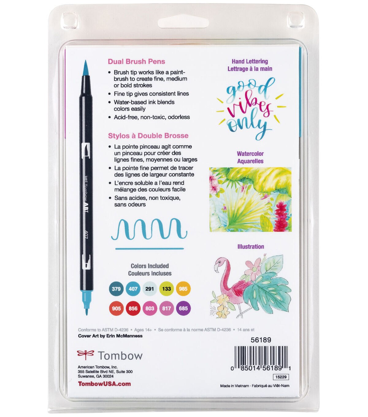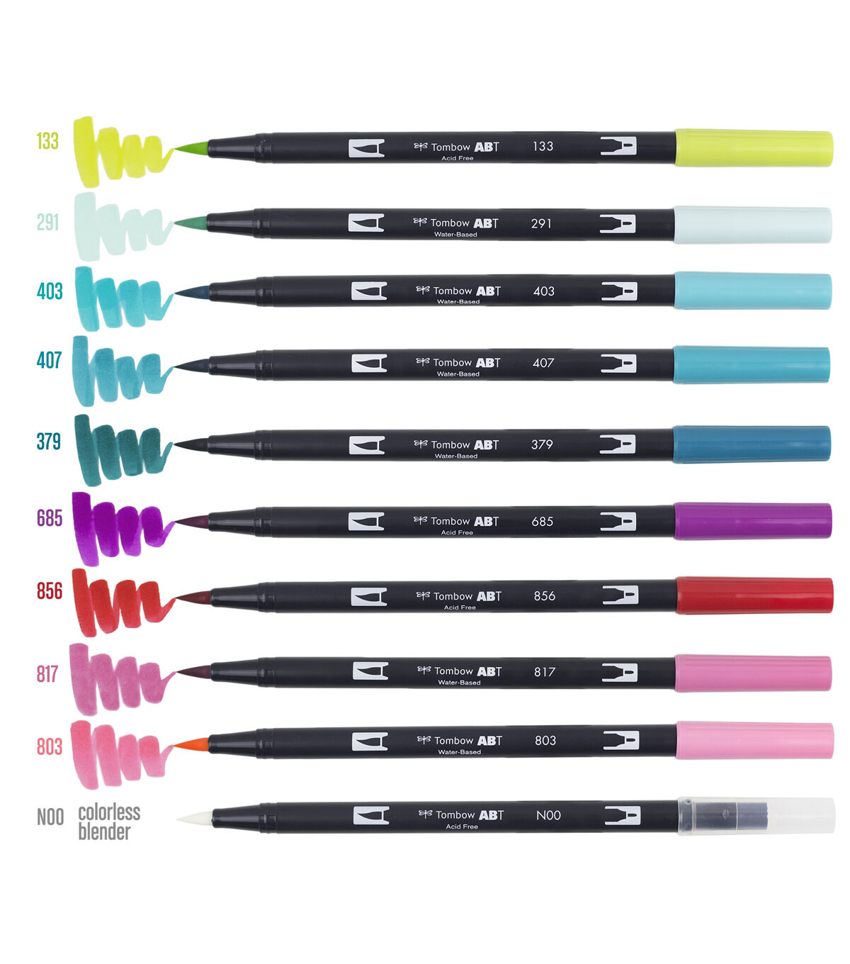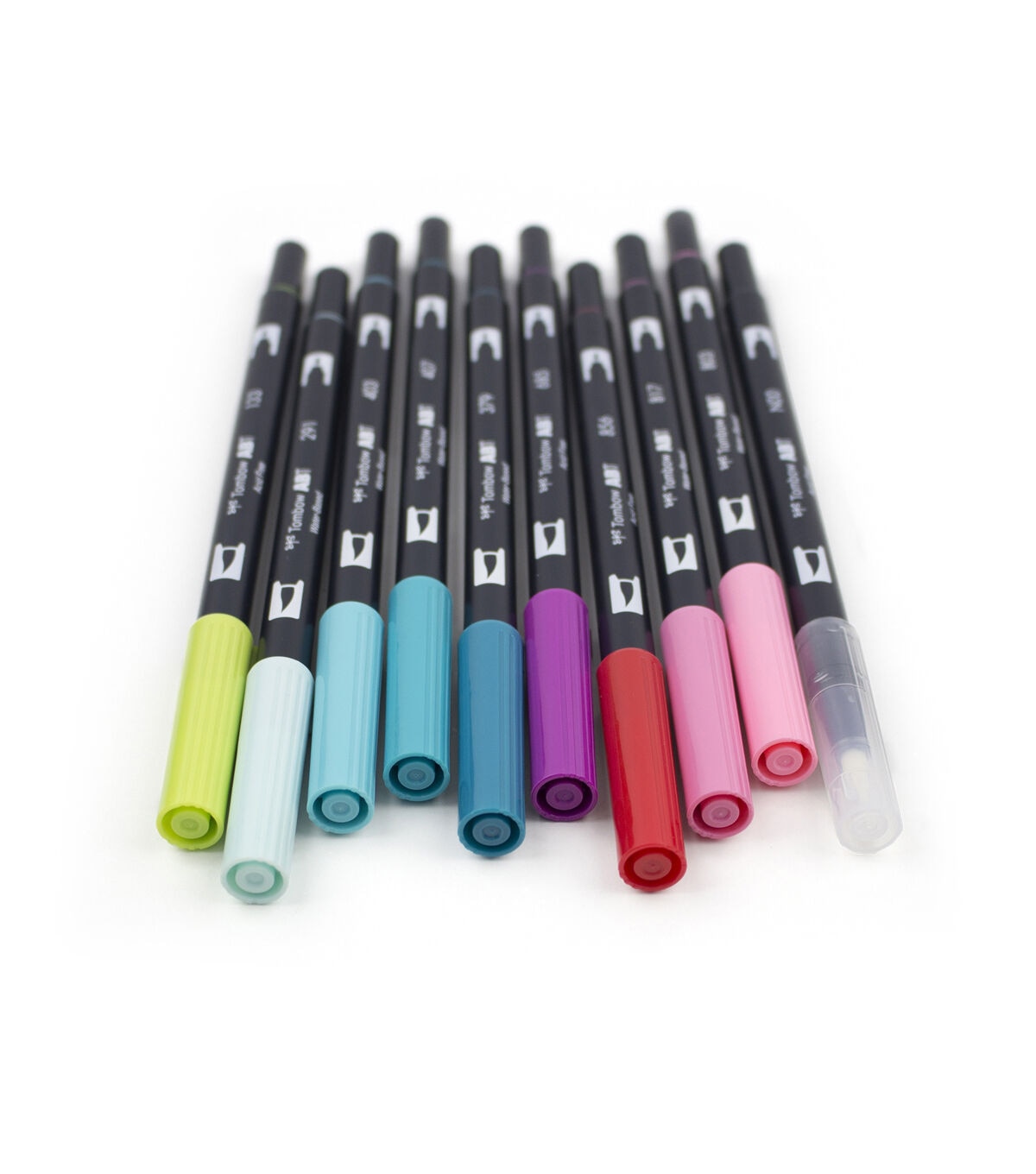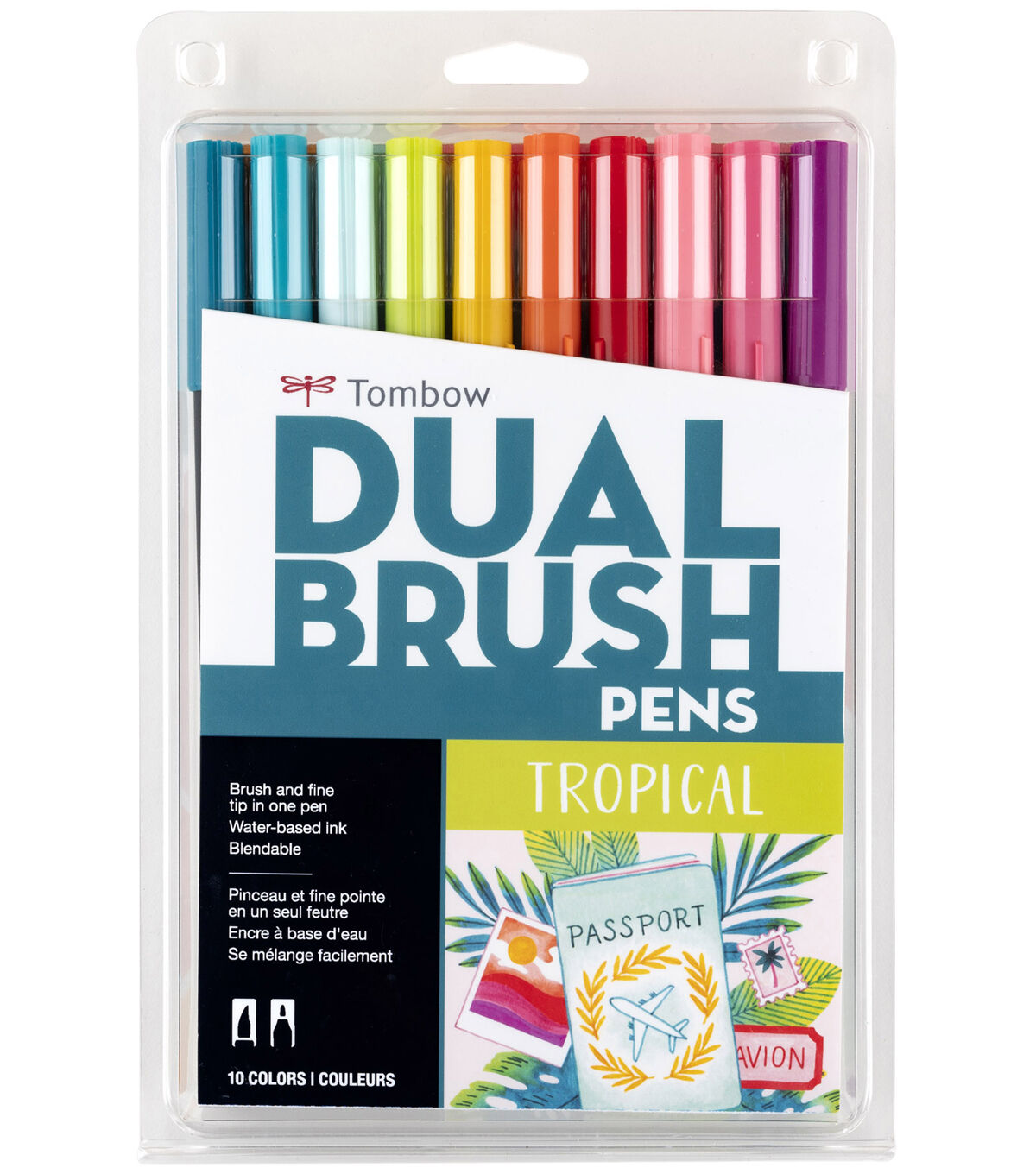 High-quality, Resilient Flexible Brush Tip & Firm Fine Tip Marking pen. "Tropical" color 10 pcs assortment(9 colors + 1 blender) in a plastic case. Flexible brush tip and fine tip in one marker. Brush tip works like a paintbrush to create fine, medium or bold strokes; fine tip gives consistent lines. Dual Brush Pens are ideal for artists and crafters. The water-based ink is blendable and the resilient nylon brush retains it's point stroke after stroke.