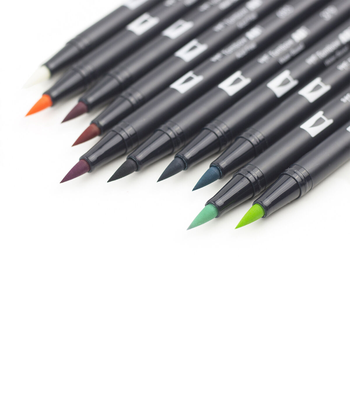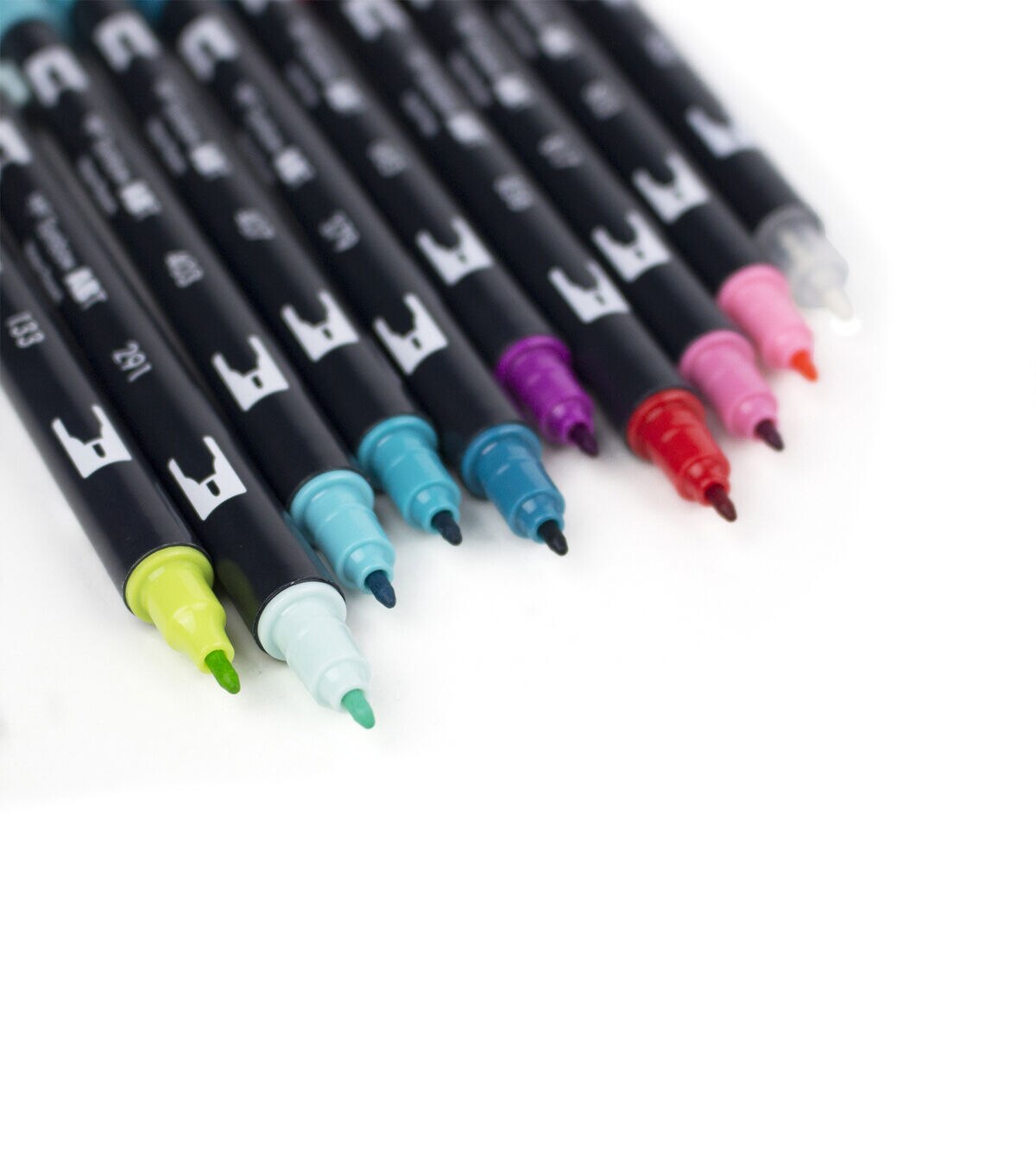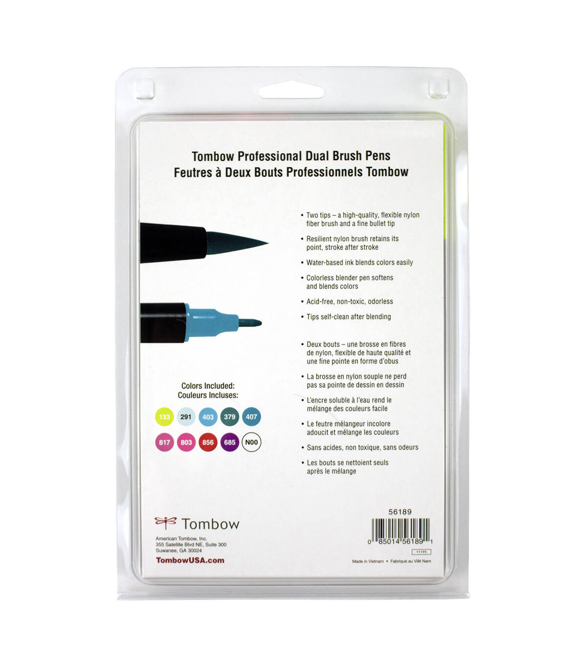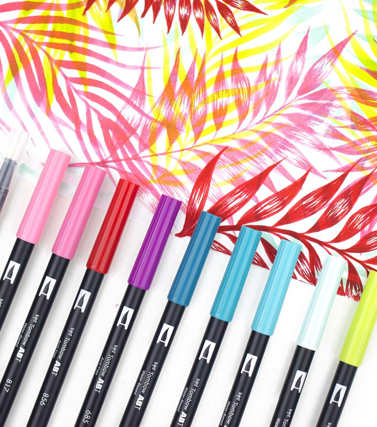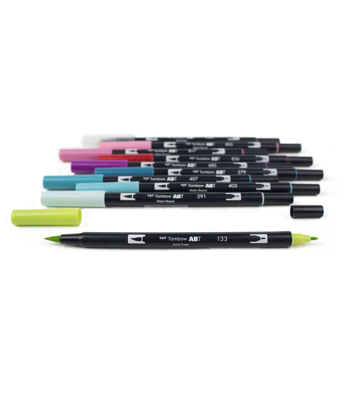 High-quality, Resilient Flexible Brush Tip & Firm Fine Tip Marking pen. "Tropical" color 10 pcs assortment(9 colors + 1 blender) in a plastic case. Flexible brush tip and fine tip in one marker. Brush tip works like a paintbrush to create fine, medium or bold strokes; fine tip gives consistent lines. Dual Brush Pens are ideal for artists and crafters. The water-based ink is blendable and the resilient nylon brush retains it's point stroke after stroke.