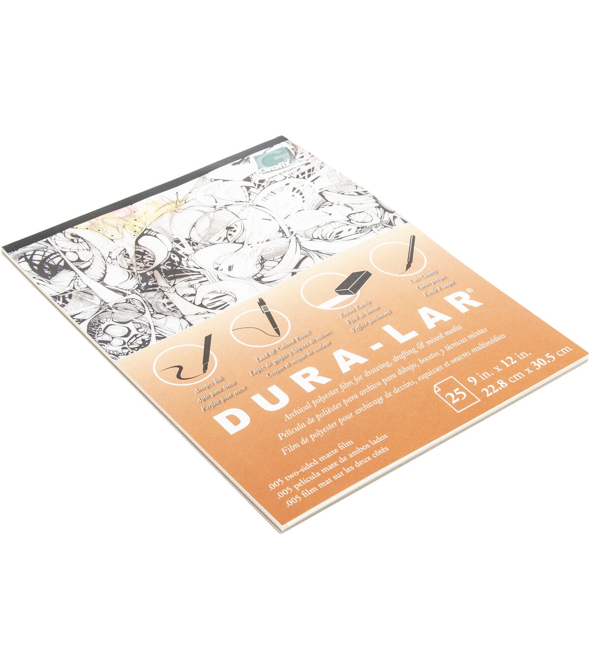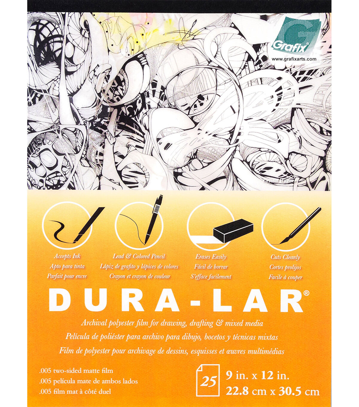 This polyester film combines the best features of Mylar and Acetate to provide a highly versatile film. It will not tear, absorb moisture or discolor with age and is heat resistant. It is dimensionally stable and lays flat. Use as an artwork surface for permanent inks and markers. This package contains 25 9x12 inch sheets of matte film. Made in USA.