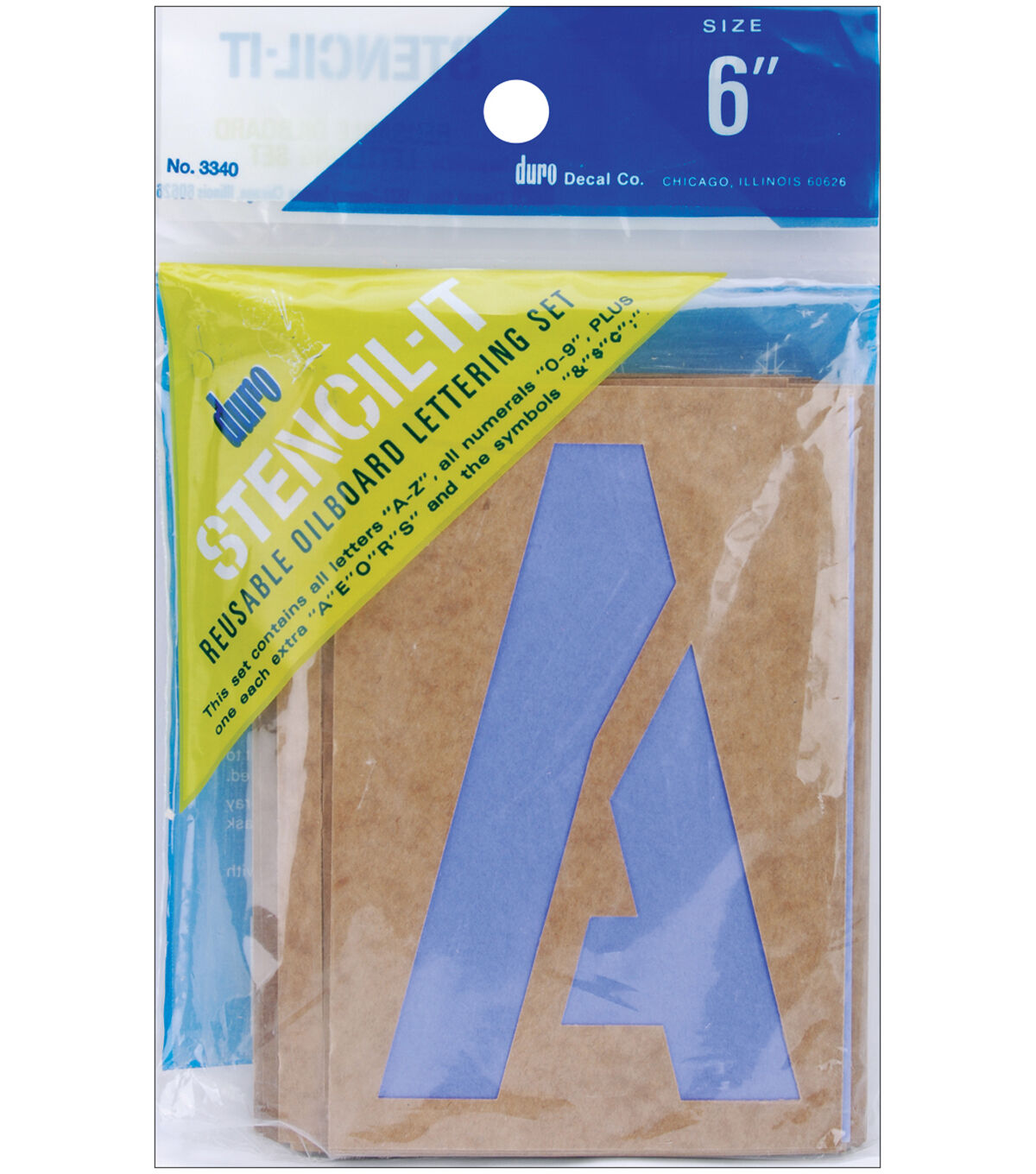 Duro-Stencil It! These high quality oil-board stencils are great for posters, scrapbook layouts, signs, windows and much more. Use then with paint, ink, chalk by using brushes, markers, pencils, sprays and just about any other application process. These stencils are lightweight, and extremely versatile. Stencils can be used over and over again. Each package contains uppercase A-Z (with extra A, E, O, R and S), numbers 0-9 and symbols. This package contains 6in stencils. Made in USA.