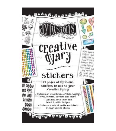 Decorate and plan in your Dylusions Creative Dyary with stickers. Creative Dyary Stickers include 24 pages of matte and clear sticker sheets. Each assorted page includes color images or black and white designs perfect for coloring in. Dylusions stickers include borders, lists, notes, bulles, tapes, sayings and shapes.