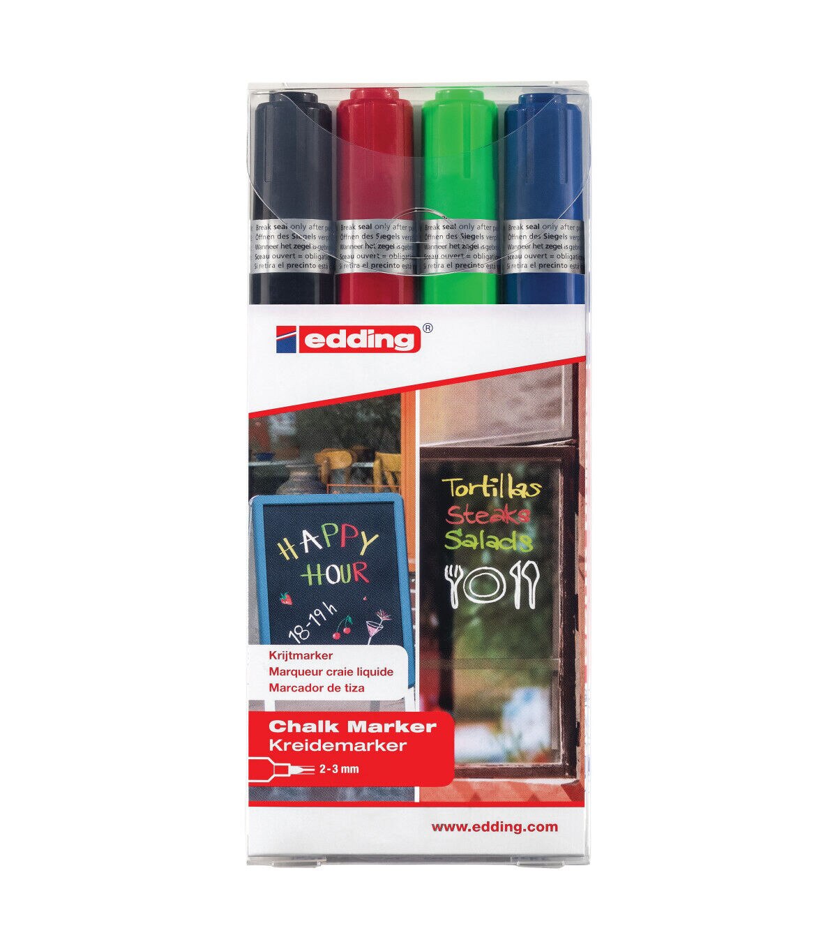 The 4095 Chalk Marker is great for non-permanent designing, decorating and writing on non-porous surfaces such as windows, dark boards, glass, plexiglas and mirrors. Its round nib releases highly opaque liquid chalk, allowing you to create distinguished markings on smooth surfaces like blackboards, mirrors and glass. Not only suitable for creative crafting at home, but also a favorite tool in businesses like restaurants, bars or the glass industry. Change your message and clean up with ease! It can be wiped off virtually all non-porous surfaces with a damp cloth. This set includes black, red, blue and green.