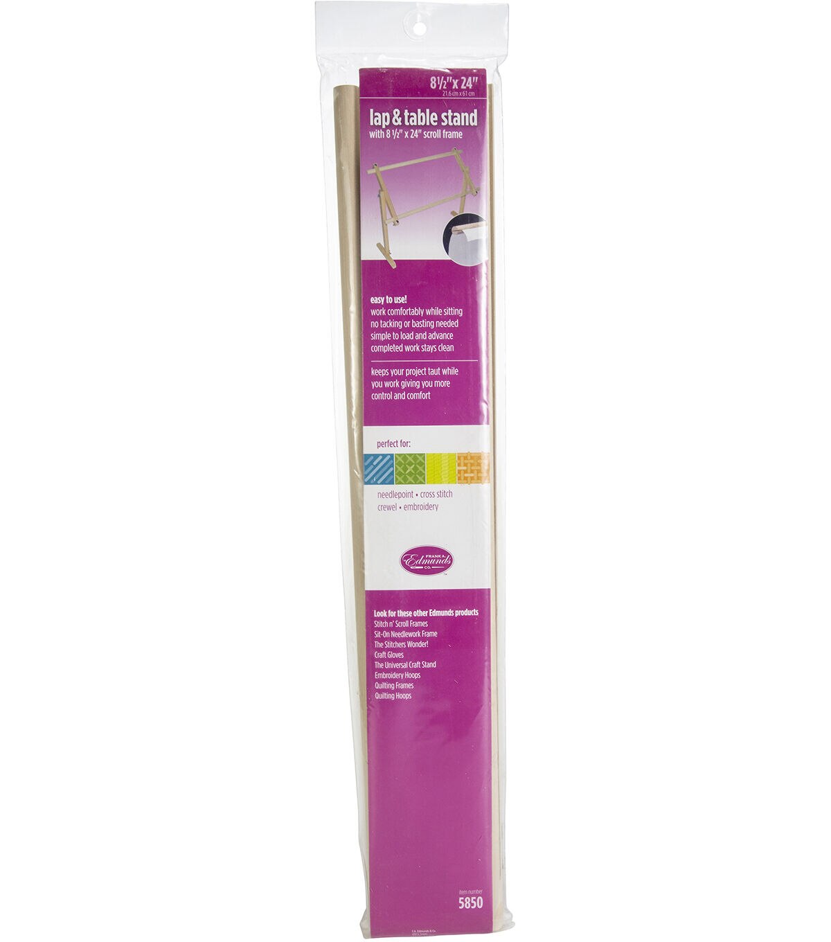 This convenient lap stand allows you to work with both hands free for better stitch control. Adjustable to different heights and widths, this stand comes complete with an 8-1/2"x24" split rail scroll frame which will fit fabric up to 21" wide. Perfect for use in your favorite chair, couch, bed, on top of a table or in the car.