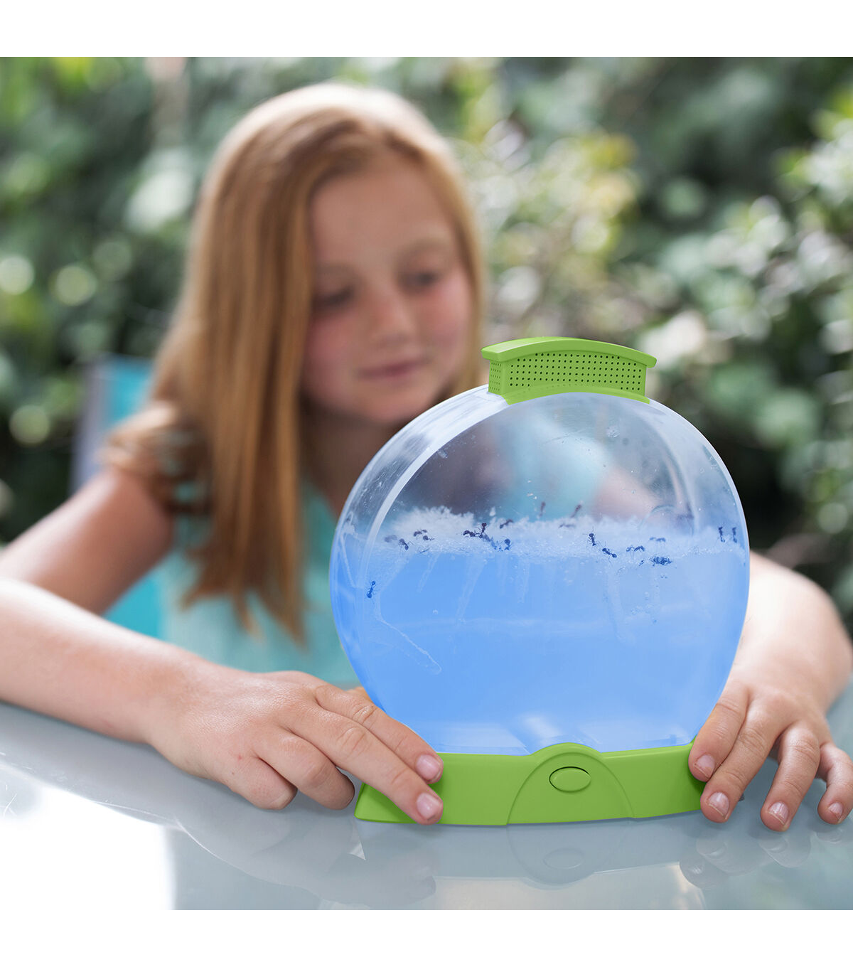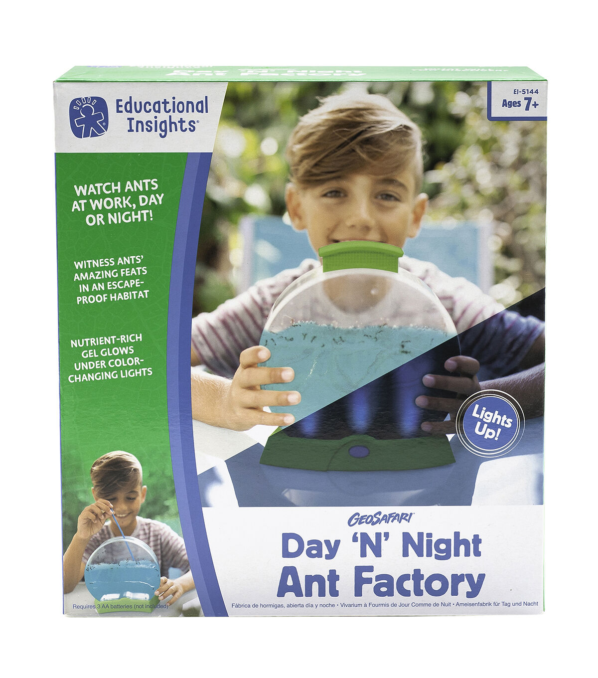 Get a firsthand look at the amazing working world of ants with the Day 'N' Night Ant Farm. The translucent, nutrient–rich, farm gel doubles as food ants can work with while they eat, eliminating the need for food or water. Witness their amazing feats by day, then switch on the color-changing LED lights and watch as the ants work the nightshift. Custom air vents keep ants safe and ventilation flowing throughout their workspace. Includes an activity guide packed with awesome ant inspiration. The nitty-gritty: • Ant habitat with unique nutrient-rich gel that eliminates the need for feeding or watering • Habitat features 3 magnification spots for up-close views of ants at work • Cool color-changing LED lights with on/off switch • Unique air vent that allows air in while keeping ants safely trapped inside • Includes activity guide and mail-in certificate for Harvester Ants • LED lights require 2AA batteries (not included)