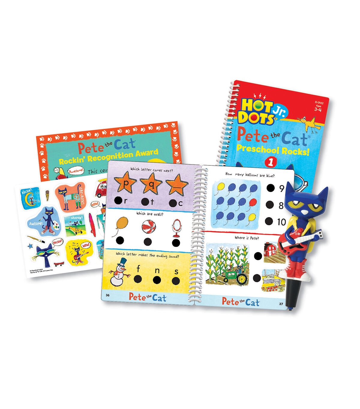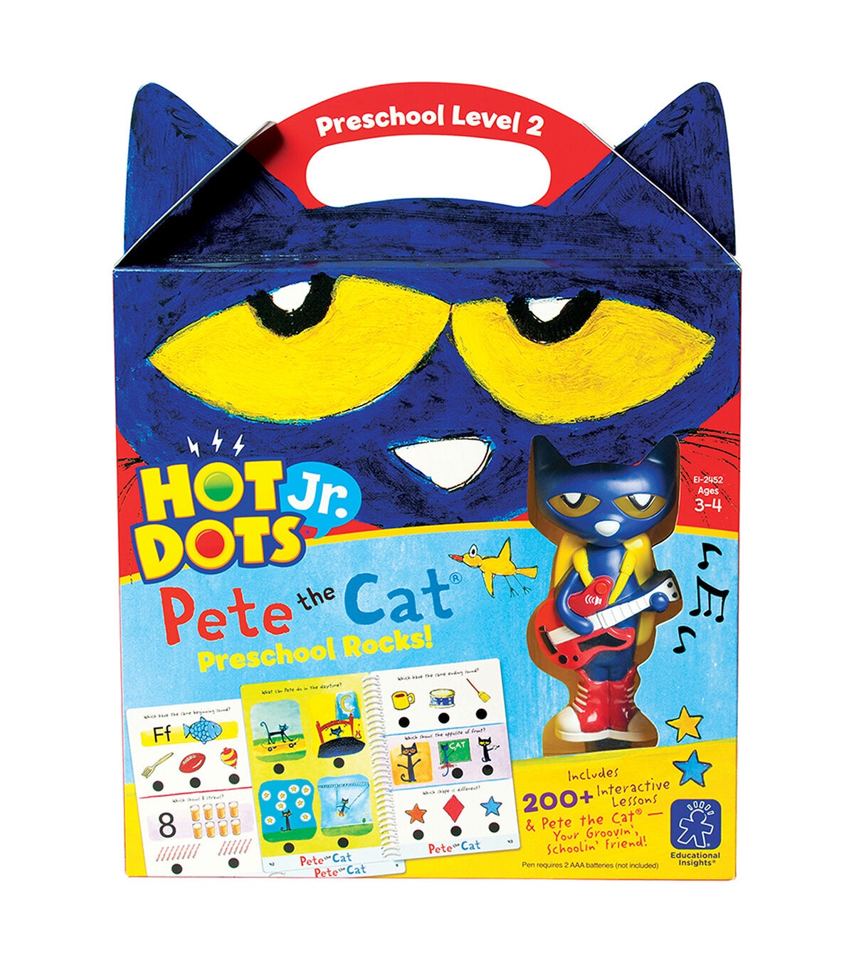 Kids will be learning in no time with the Educational Insights Hot Dots Jr. Pete the Cat Preschool Rocks! Set. It is a perfect complement to the Pete the Cat storybooks that children, parents and teachers already love. This set provides 200+ lessons on a variety of subjects such as reading, math, science, social studies and more. It includes two spiral-bound activity card sets, an Pete the Cat Your Groovin Schoolin Friend pen, reward stickers and an award certificate for little learners who are ready to advance to the next level. Perfect for independent learning, simply press the pen on an answer for immediate audio and visual feedback. It promotes rockin, interactive learning and offers ample practice time. It also develops early learning skills necessary for school success. The game helps develop preschool skills in reading, math, science, social studies and more. It is compatible with any Hot Dots or Hot Dots Jr. card sets or activity sets. The pen requires two AAA batteries, sold separately.