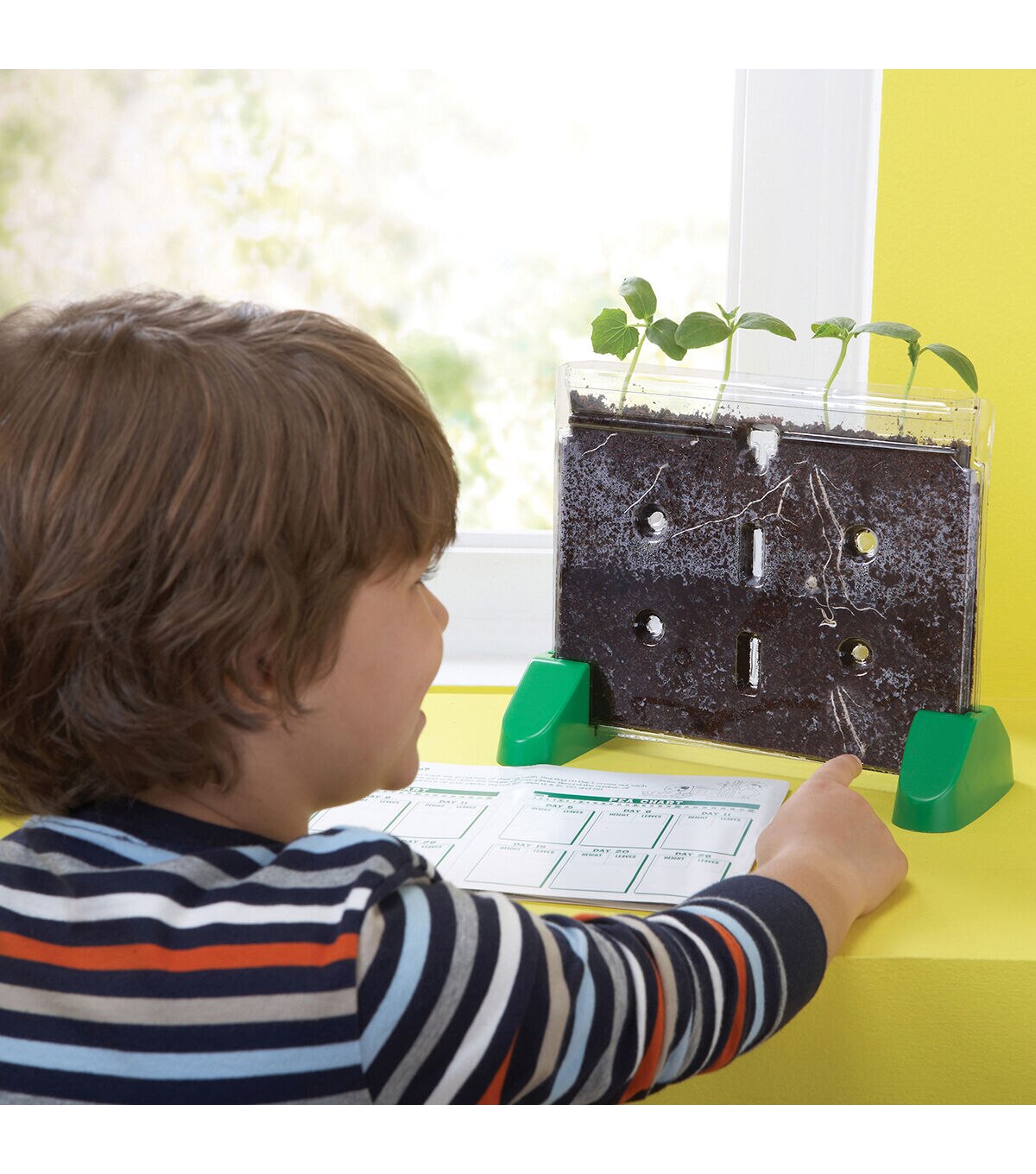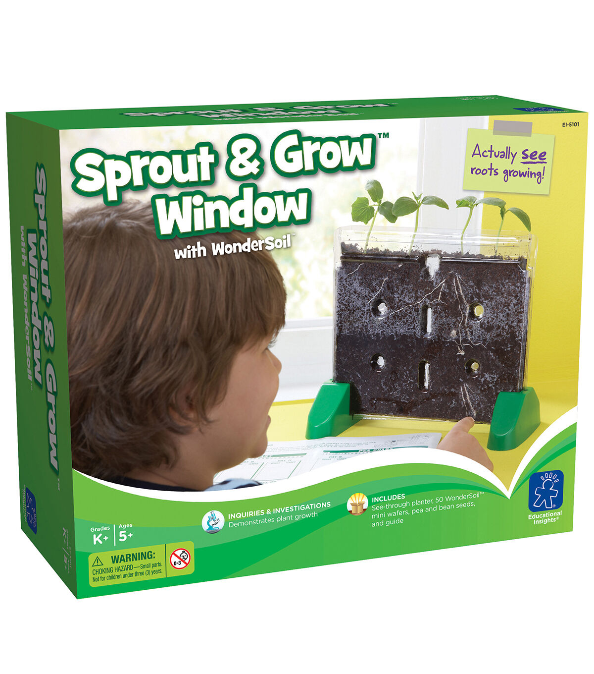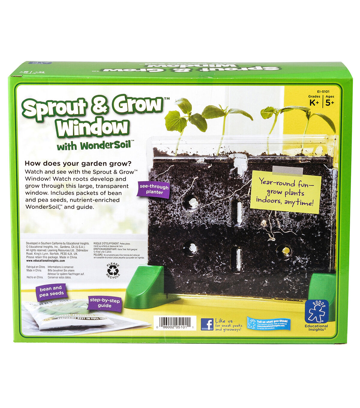 See plant science in action from roots to leaves with the Educational Insights Sprout & Grow Window. This transparent ‘nature’s window’ allows gardeners of all ages to watch seeds sprout and grow into plants, right before their eyes. The large, transparent window stands upright on a tabletop or windowsill. It features transparent, self-supporting window planter that allows students to view what happens beneath the soil as plants sprout, develop roots and grow tall. This kit includes bean and pea seed packets, enriched soil for optimum growth, step-by-step instructions, suggested activities and journal pages for writing observations. Kids will get a worm-eye view of root growth. Recommended for ages five to 11.