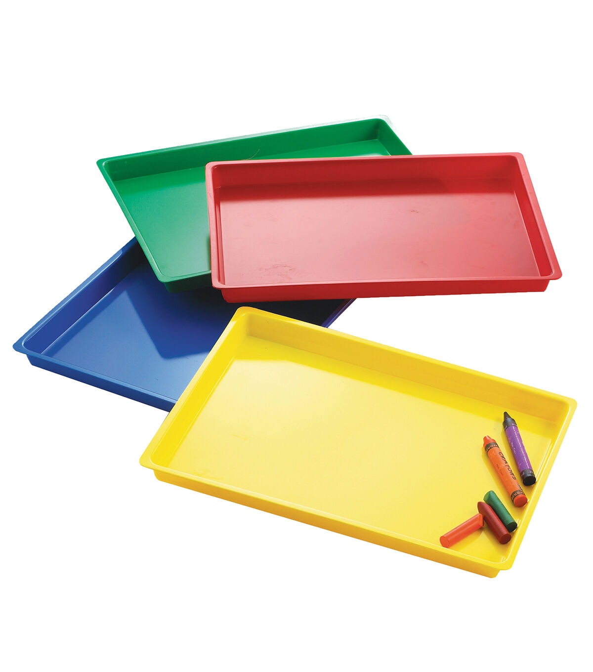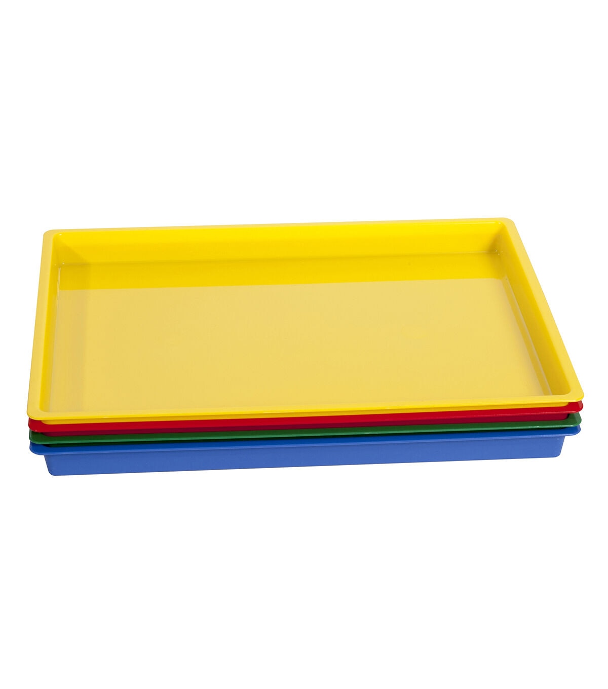 The possibilities are endless with this set of 4 heavy-duty multi-purpose trays in 4 colors! Keep art projects neatly contained and organized; large enough in size to fit a standard 8.5" x 11" piece of paper or a worksheet with plenty of room for manipulatives to fit inside tray on the sides. Suitable for finger painting projects, collaging, clay or playdough, and other messy art projects. Or use for individualized sensory activities filling trays with, water, sand, plastic sensory pellets, beads and more! Trays measures 12" x 16" x 1".