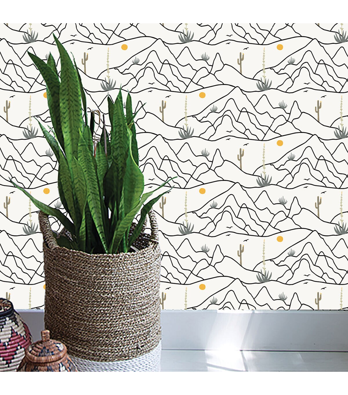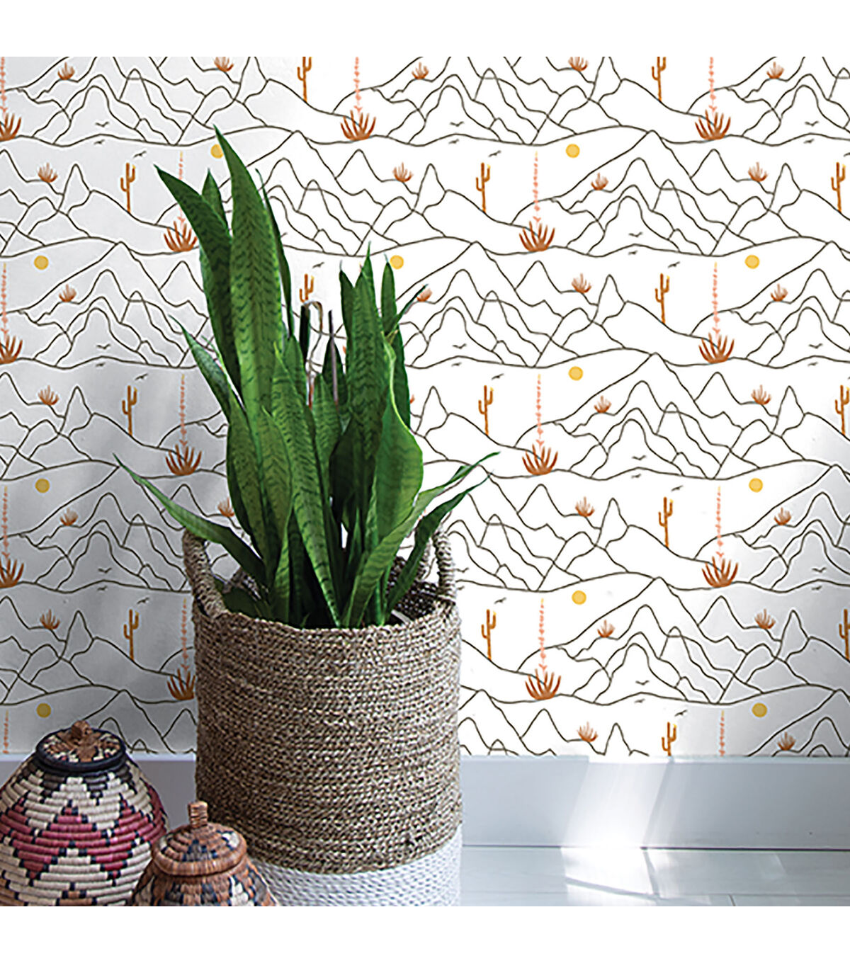 DESERT AFTERNOON bounded by distant mountains, we apreciate the wild beauty of saguaro cacti and brittlebush in midday heat. Add a touch of the midwest to home easily with Desert Afternoon peel and stick wallpaper. Do not apply peel and stick wallpaper to textured walls, unfinished drywall/ plaster, existing wallpaper, non-stick paint or cinder block.