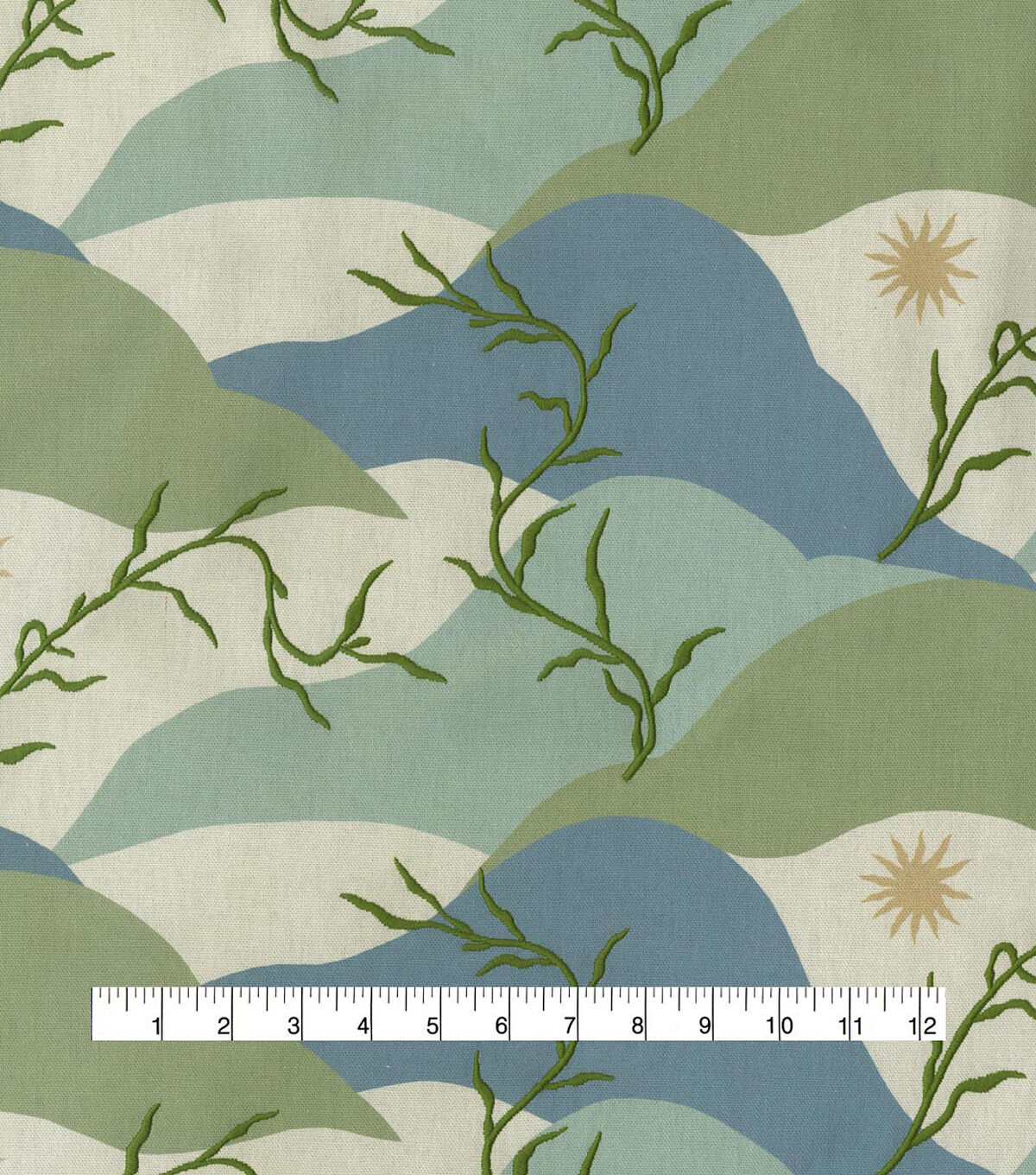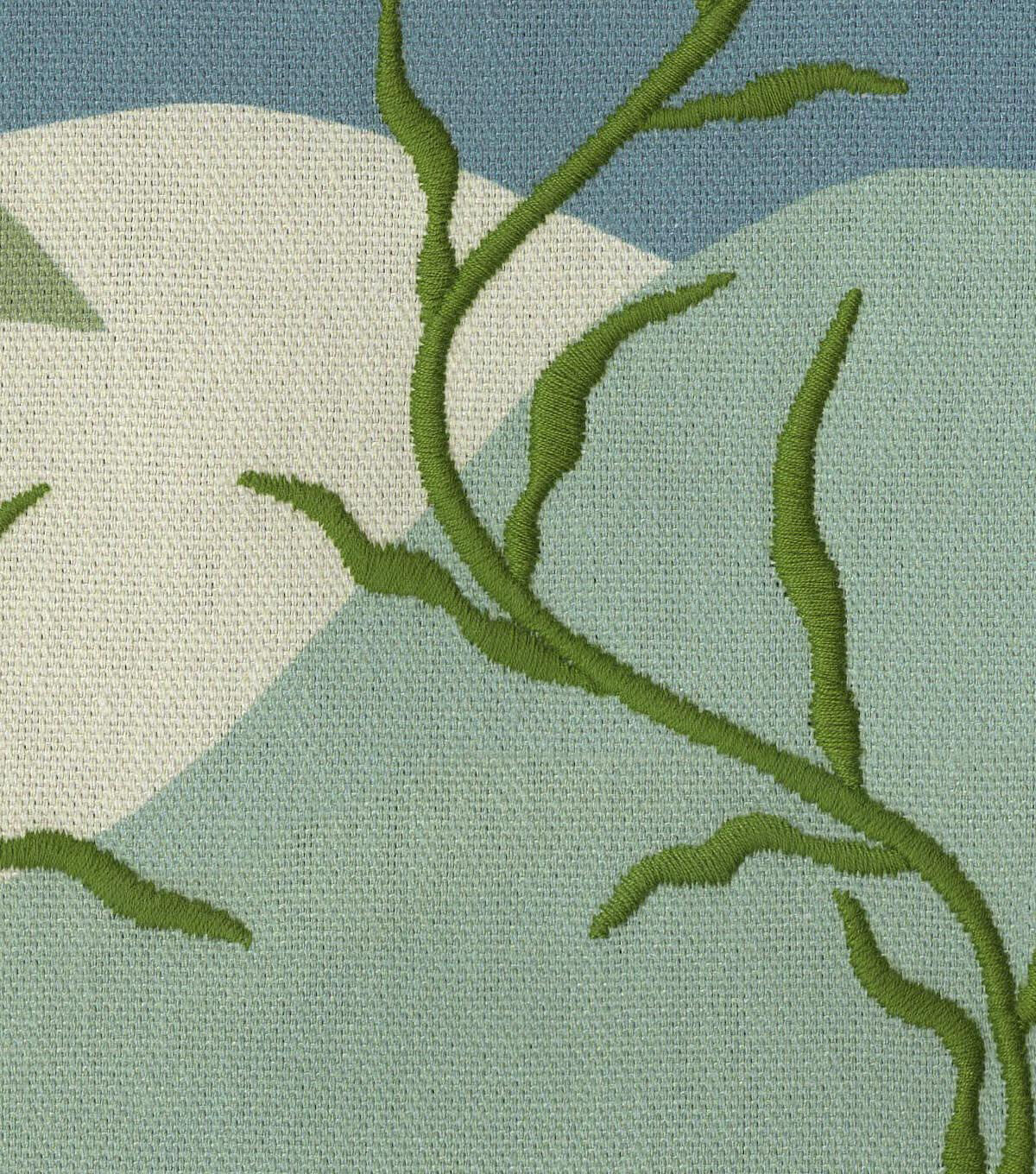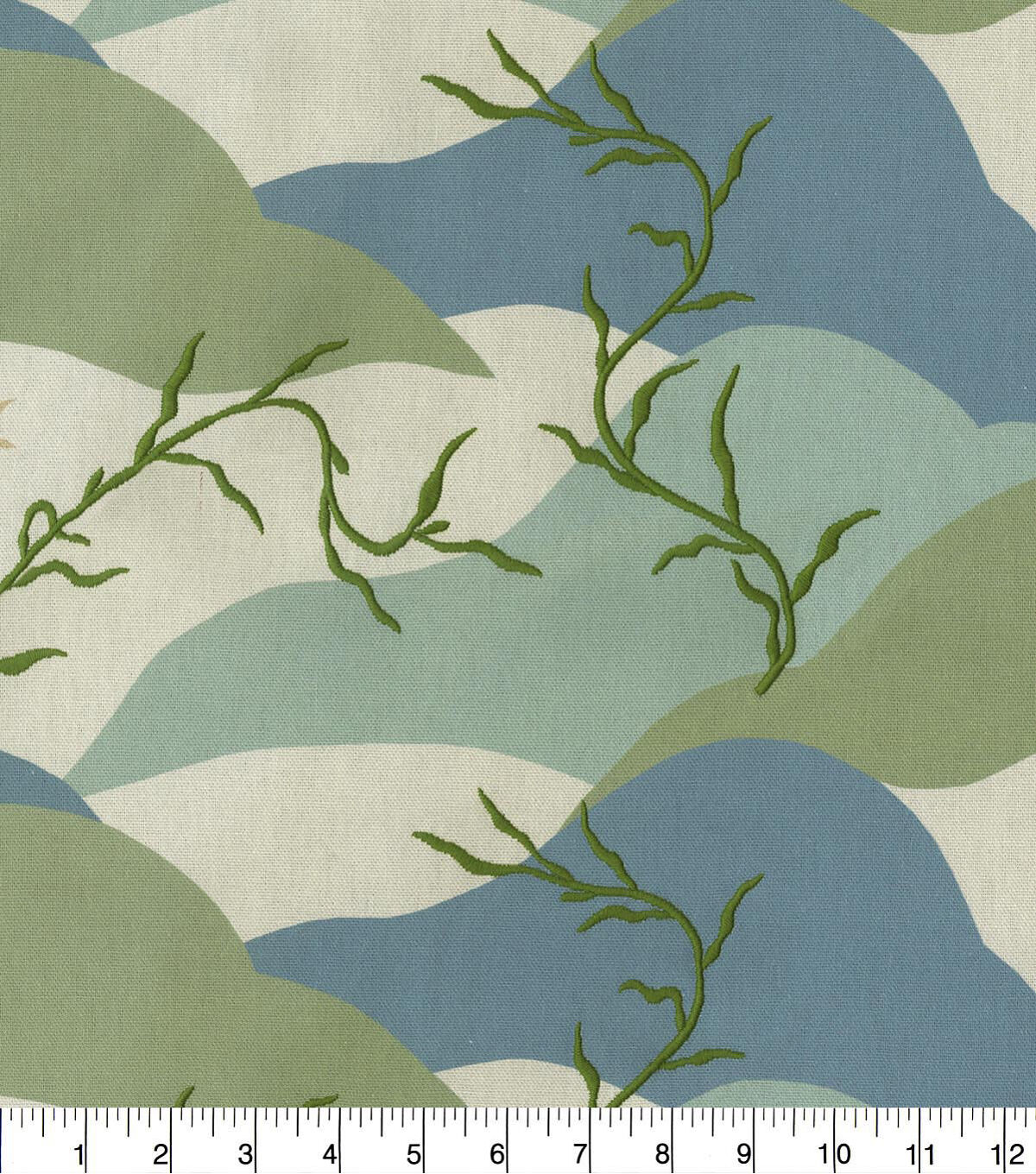 Elana Gabrielle Washed Ashore, ocean waves come rolling in toward the foggy beach shore only to recede and leaving embroidered fronds of seaweed upon the shore. Printed on a 100% plain weave cotton. This embroidered fabric is perfect for window treatments, decorative pillows and almost nay craft project.