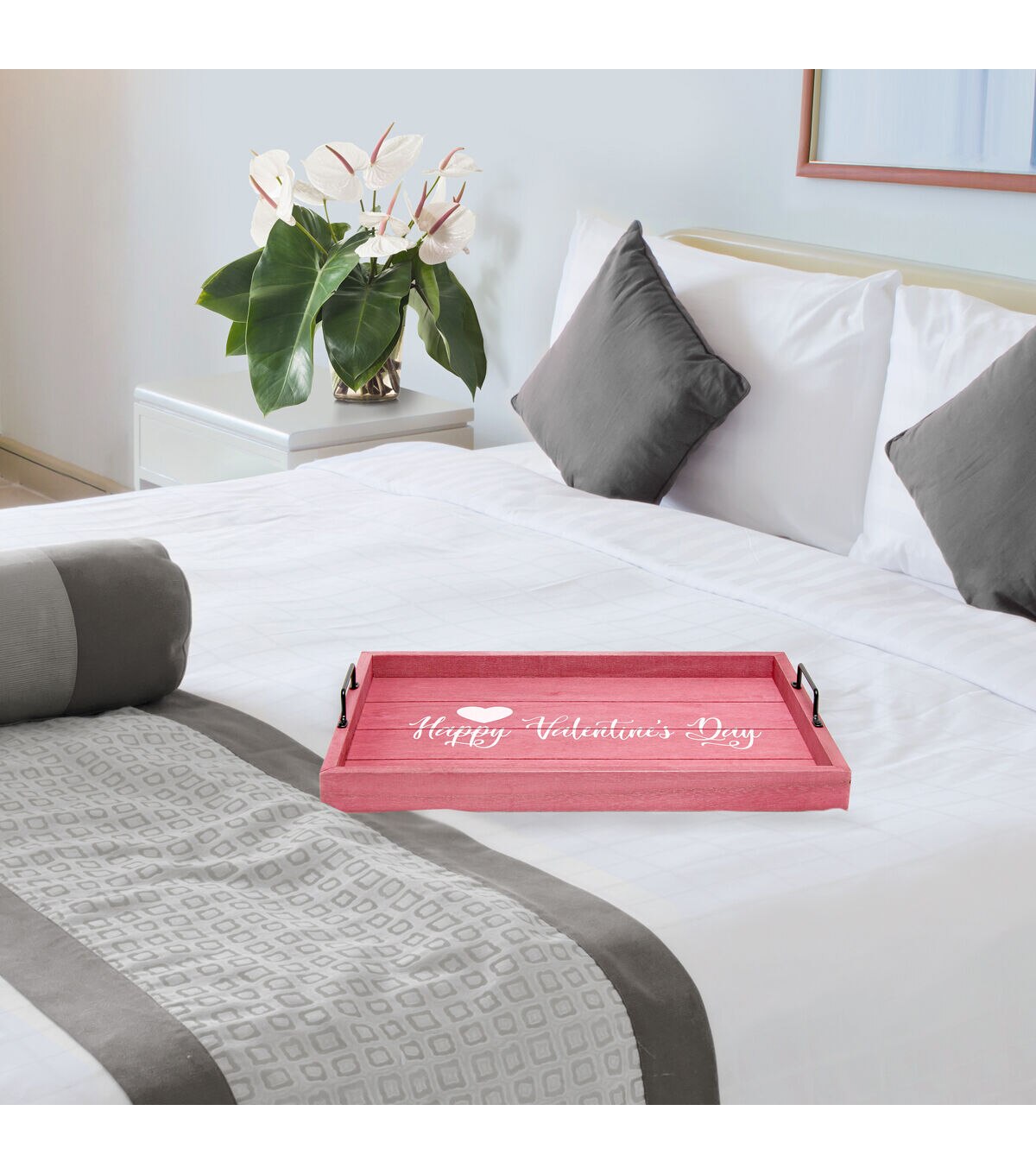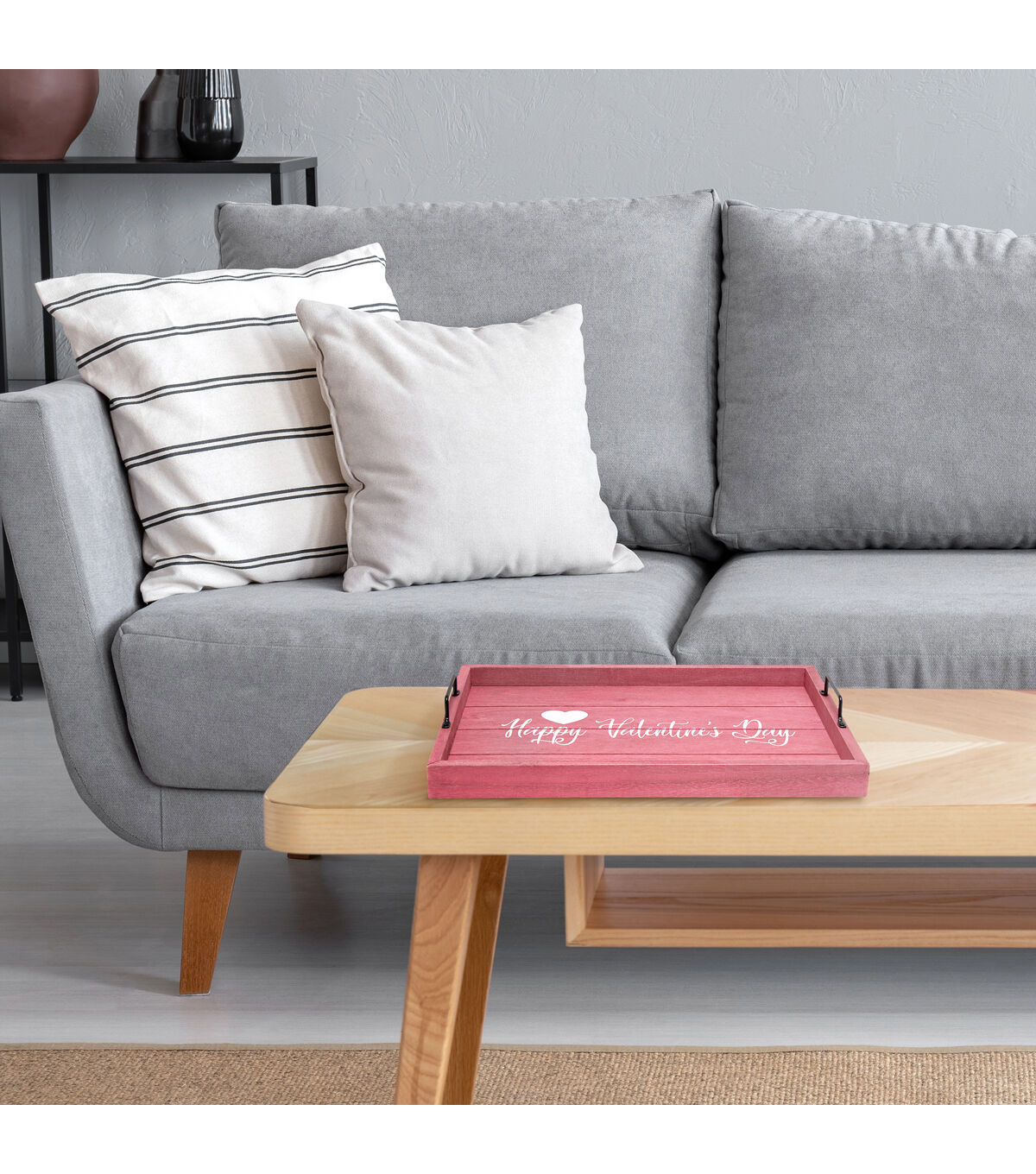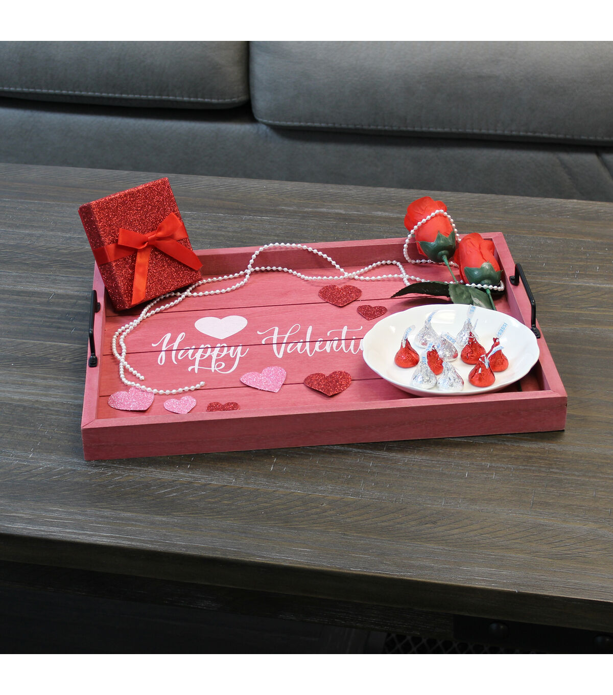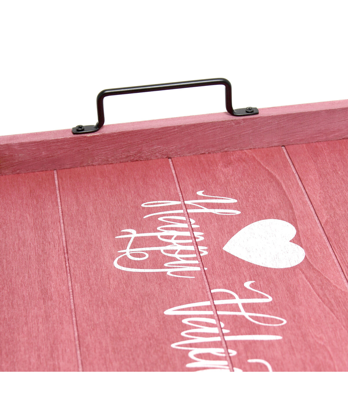 Freshen up your home with this dark pink wash wooden tray! Accented with black metal handles and white text beside a heart graphic, this tray is on trend to give your home that cozy farmhouse feel. Use to serve breakfast in bed, food and drinks at a party or makes for an excellent centerpiece for your dining table, kitchen counter, coffee table or ottoman.
