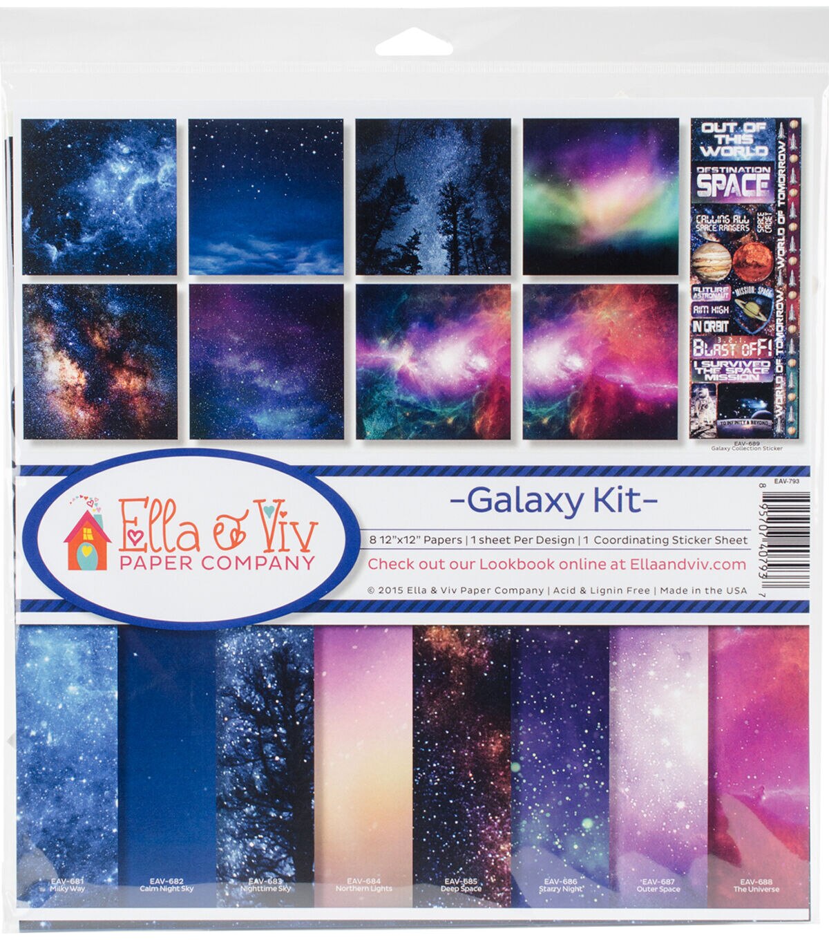 Ella And Viv-Galaxy Collection Pack. The perfect start to your next paper crafting project! This package contains eight 12x12 inch single-sided papers with a different design on each and one 12x4- 1/4 inch coordinating sticker sheet. Acid and lignin free. Made in USA.