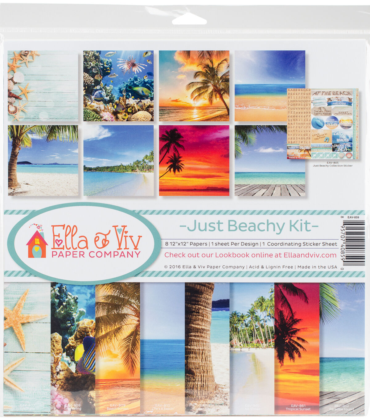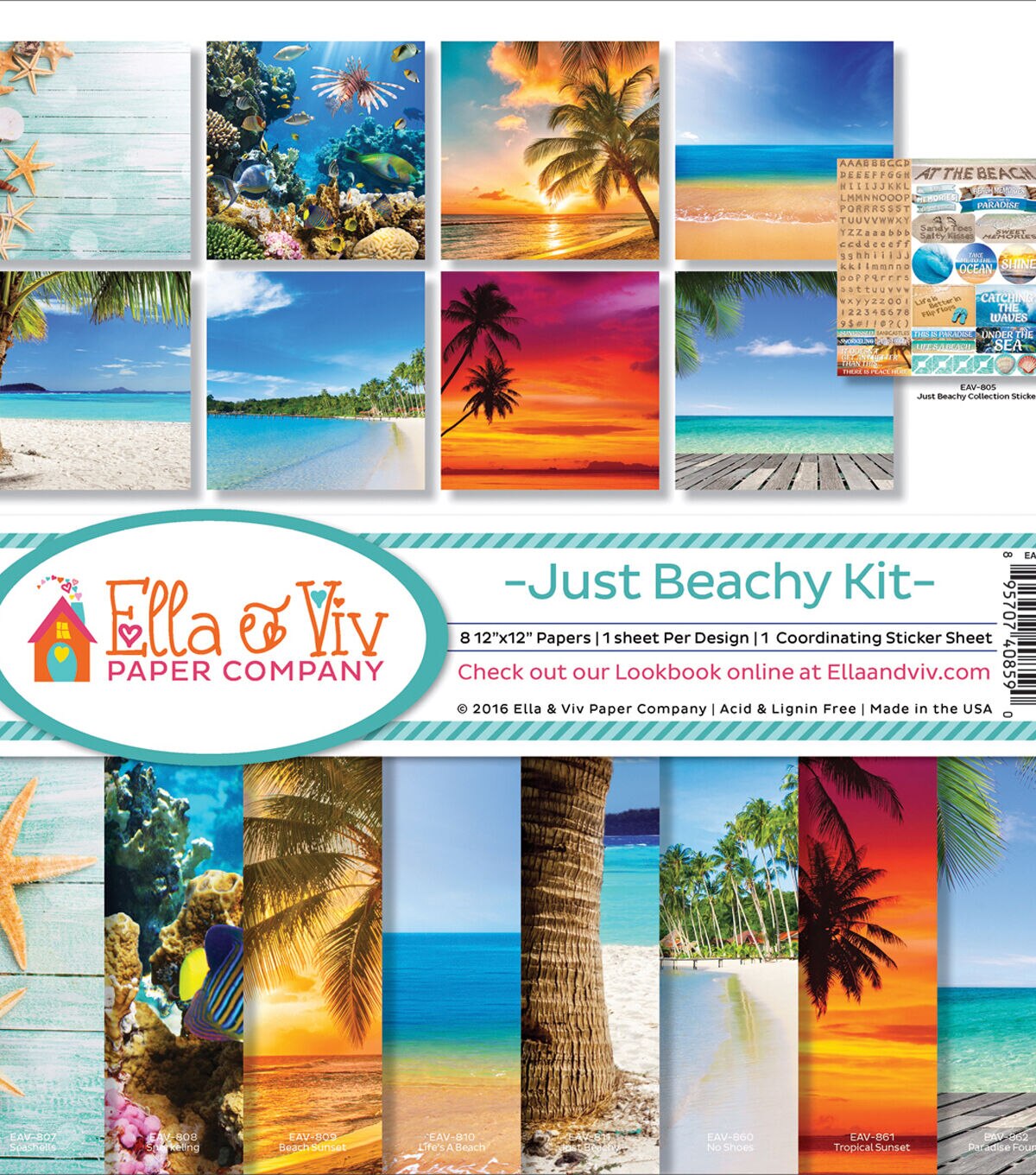 Ella And Viv-Just Beachy Collection Kit. The perfect start to your next paper crafting project! This package contains eight 12x12 inch single-sided papers with a different design on each and one 12x12 inch coordinating sticker sheet. Acid and lignin free. Made in USA.