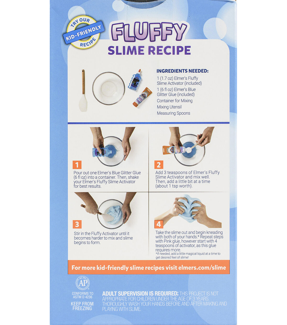 Everything needed to make advanced and hard-to-make slime. This package contains assorted ingredients to make slime. Comes in a variety of slimes. Each sold separately. Non-toxic. Conforms to ASTM D 4236. WARNING: Choking Hazard- small parts. Not for children under 3 years. Imported.