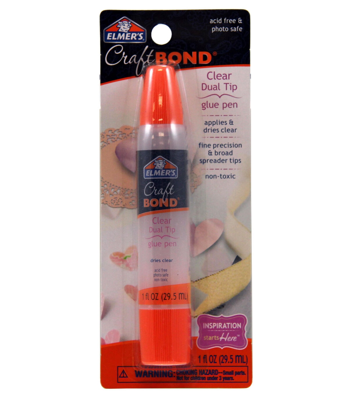 ELMER'S-Craft Bond Dual Tip Clear Glue Pen. This glue pen features a narrow tip for precise application and a wide spreader tip for more coverage. Glue goes on clear and dries clear. Glue is acid free and photo safe. This package contains one 1 ounce Glue Pen. Conforms to ASTM D4236. Imported.