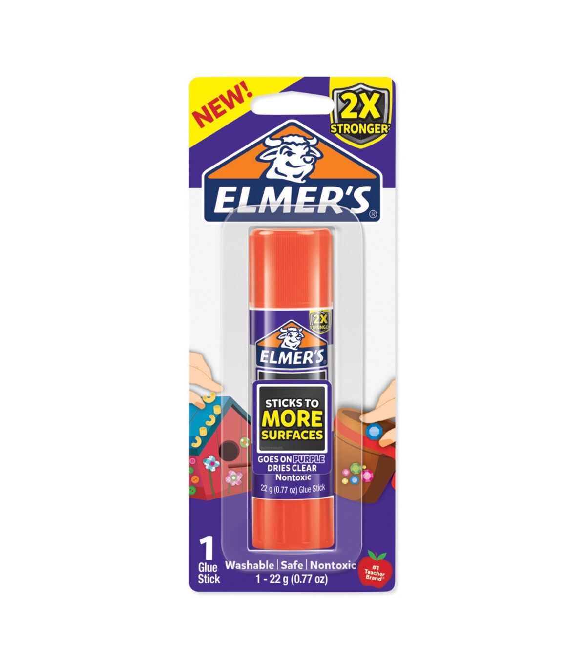 The Elmer's Jumbo 2X Stronger Glue Stick is as strong as liquid glue with the speed of a glue stick. This extra strength glue stick is two times stronger than current school glue sticks. It works on wood, ceramics, macaroni, glitter and felt. The glue has a quick dry time.