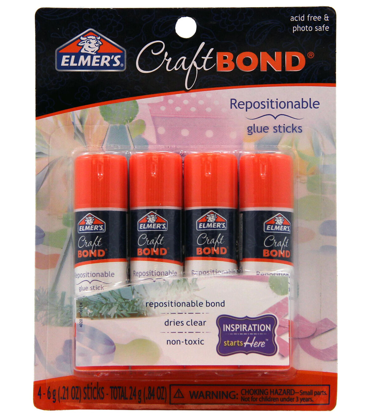 ELMER'S-Craft Bond Repositionable Glue Sticks. This glue gives you a repositionable bond and is perfect for papercrafting projects. Convenient and mess free. Archival quality. This package contains four 0.21 ounce glue sticks. Conforms to ASTM D4236. Imported.