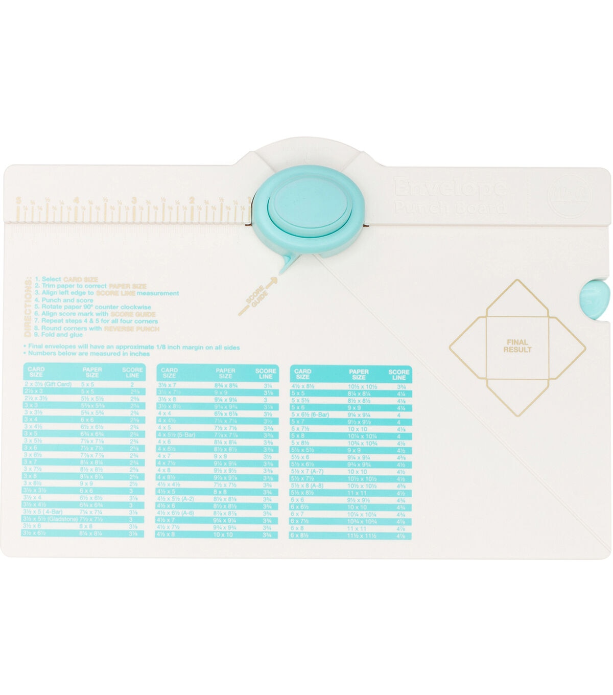 WE R MEMORY KEEPERS-Envelope Punch Board. This is the easiest envelope maker on the market! Just punch and score. The 2-way envelope punch creates fold tabs and round corners. It is easy to create designer envelopes in dozens of sizes. Printed on the punch board are a variety of cards sizes; paper sizes; and the score lines. This package contains one 6-3/4x10-1/2 inch score board; 2- way envelope punch; bone folder and measurement chart. Imported.