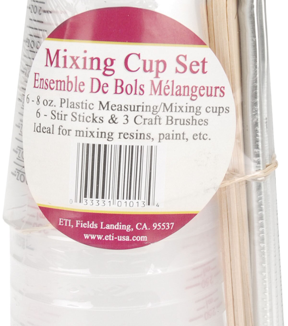 ENVIRONMENTAL-Mixing Cup Set. Ideal for mixing resins, paint and more! This package contains six 8oz measuring/mixing cups, six 5- 1/4 inch stir sticks and three six inch craft brushes. Made in USA.