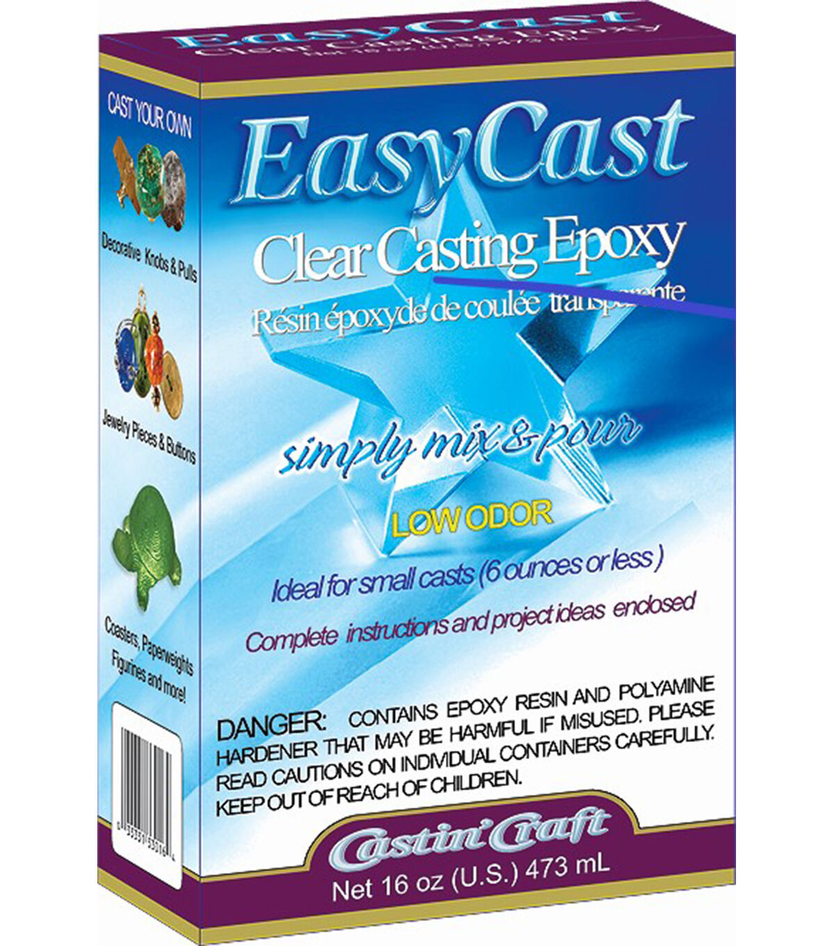 Easycast is an easy to use 1 to 1 ratio, two-component, clear casting epoxy. It is ideal for casting small decorative items such as jewelry, figurines, paperweights, coasters, knobs and more. Embedding or encasing items is easy and fun. Color easycast with casting' craft transparent dyes for the colored glass look or opaque pigments for solid colors.