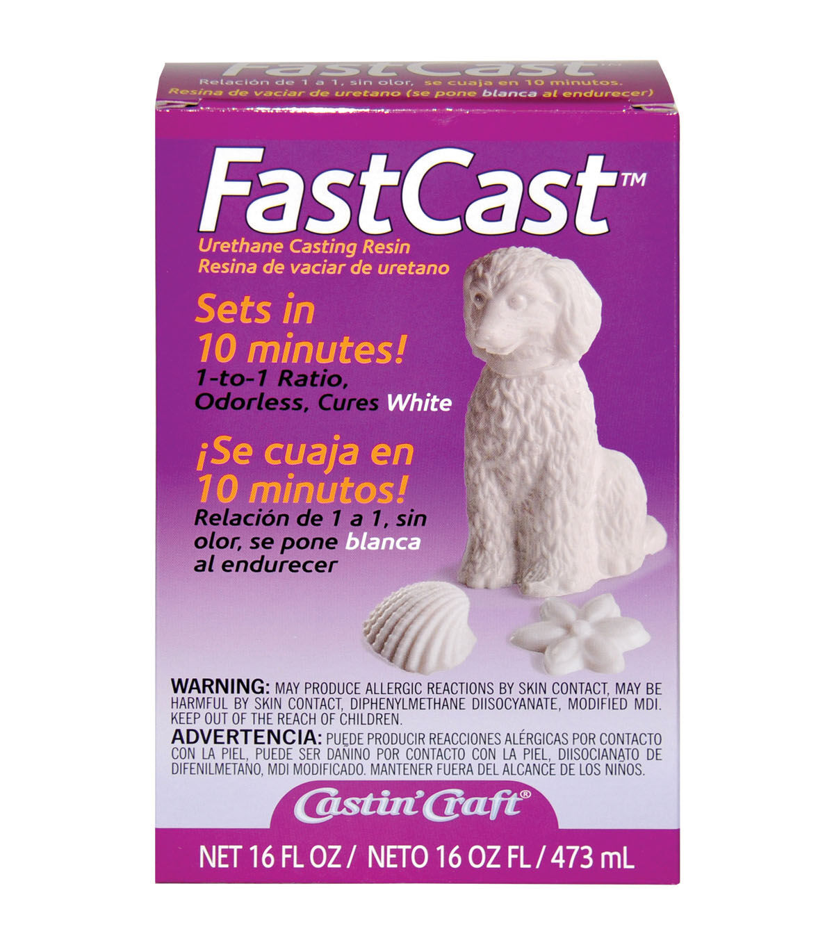 Environmental- Castin'Craft FastCast White Casting Resin. This casting resin is ideal for casting prototyping, miniatures, models, taxidermy and more. This package contains two 16 oz containers of white casting resin, and a set of instructions. Conforms to ASTM D 4236. WARNING: This product contains chemicals known to the State of California to cause cancer, birth defects or other reproductive harm. Do not mouth or chew. Made in USA.