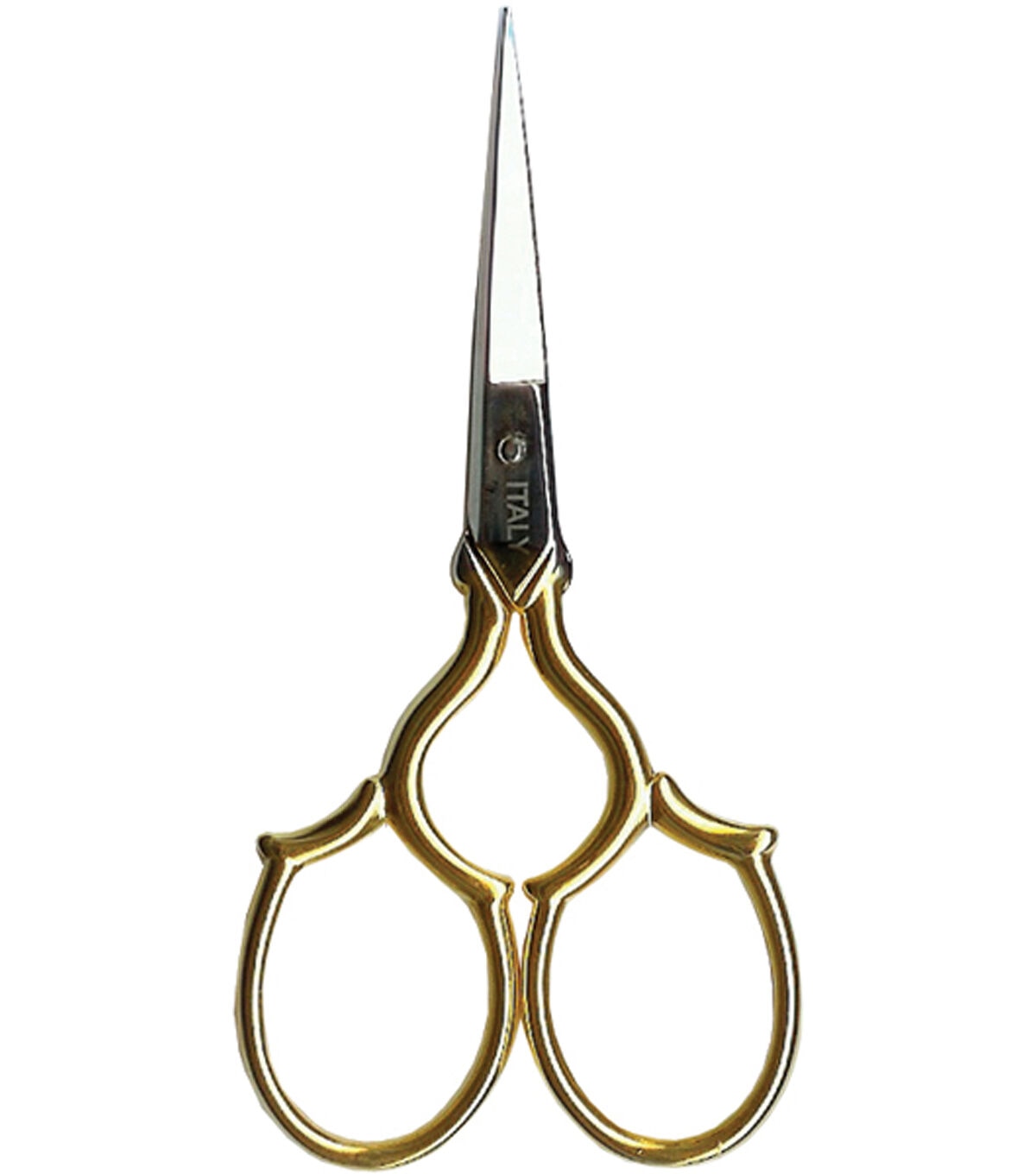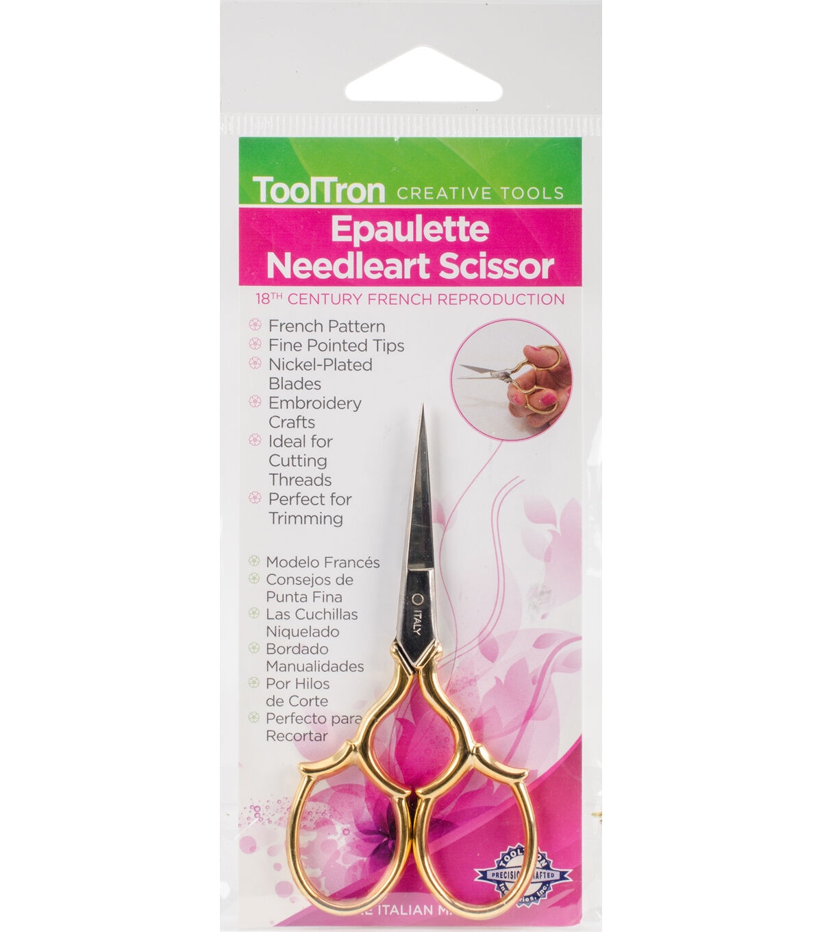 TOOL TRON- Stainless steel Blades with gold-Plated french pattern handles. European made scissors with fine leather sheath to protect scissor tips. Perfect size for all needles arts projects, embroidery or cutting thread. Perfect for trimming. Fits easily into purse or project bag.