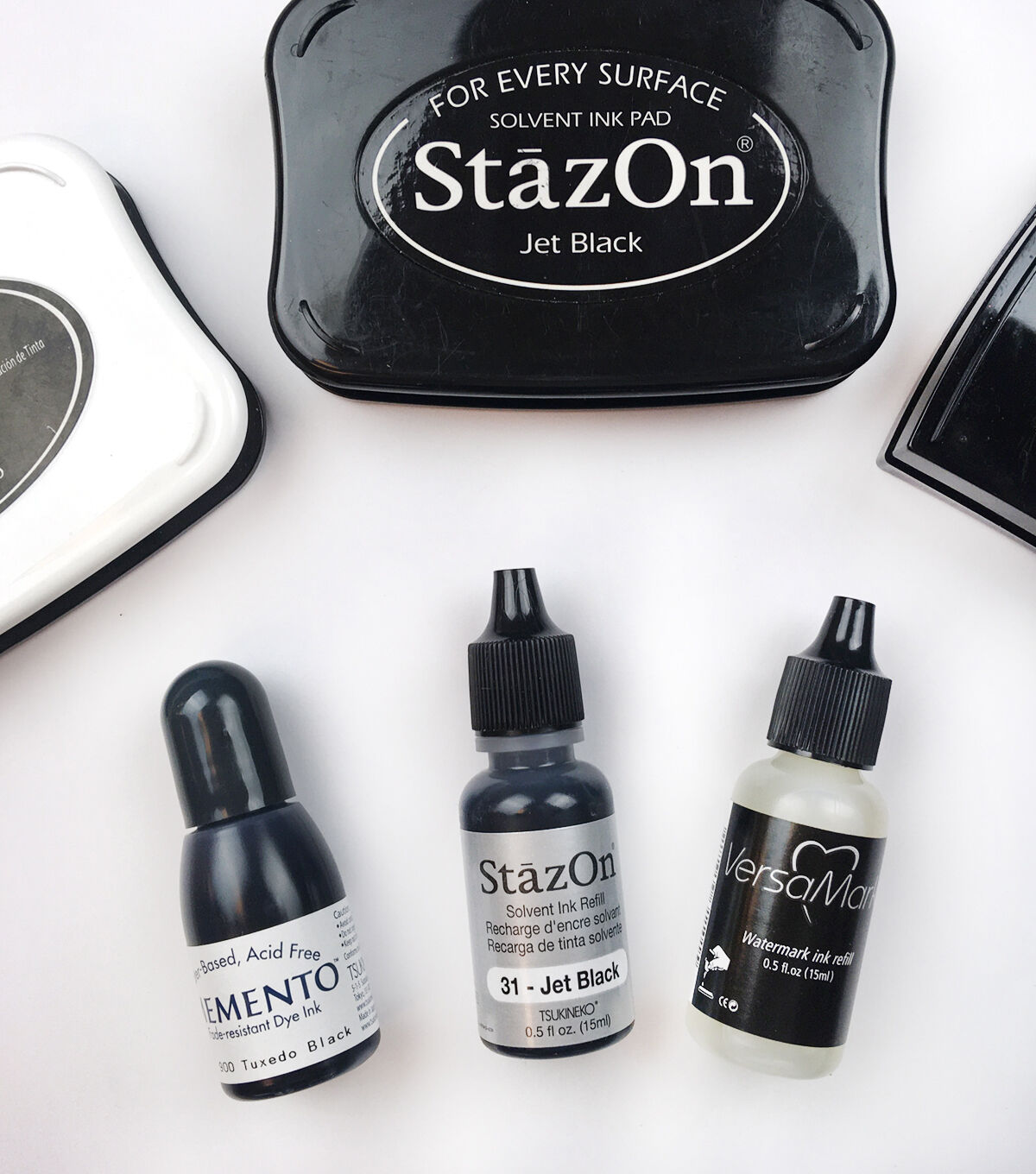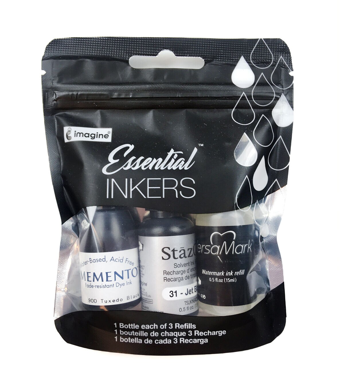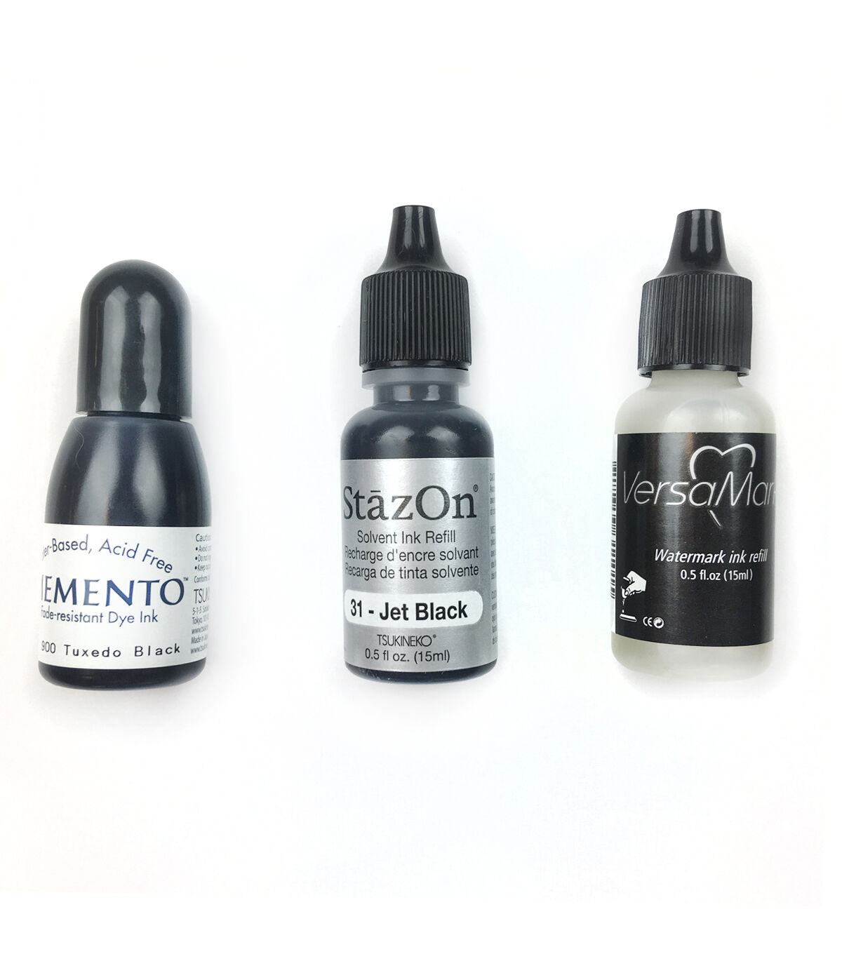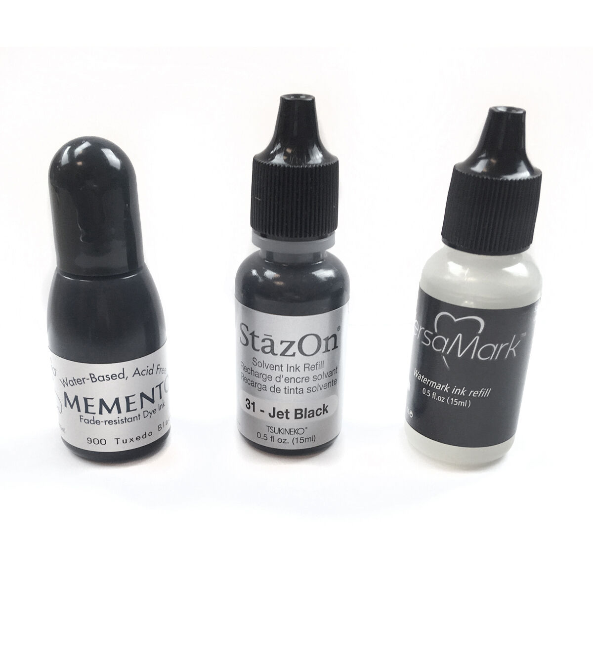 TSUKINEKO-Essentials Inkers. This package contains three refill bottles of various inks. Included is one bottle of Memento-- a water-based fade-resistant dye ink, StazOn-- a fast-drying solvent ink designed especially for use on non-porous surfaces, and VersaMark-- a watermark stamp ink that creates translucent images. The Momento is Tuxedo Black and the StazOn is Jet Black. Each has 0.5 fl.oz. and all are acid free. Conforms to ASTM D4236. Imported.