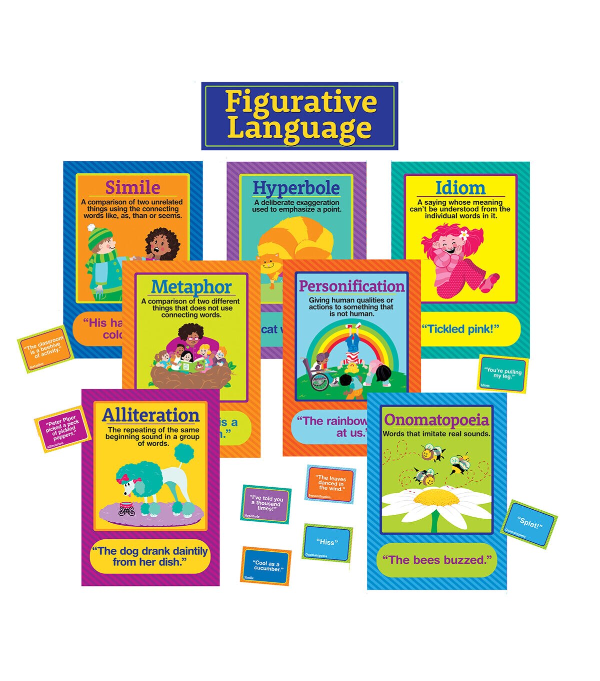These colorful mini posters (each measuring 12" x 17") illustrate seven types of figurative language: Simile, Metaphor, Idiom, Hyperbole, Alliteration, Onomatopoeia and Personification. Teacher Guide and eight practice cards with additional example phrases are included. Eureka Bulletin Board Sets are an excellent resource for students and help to reinforce daily lessons.