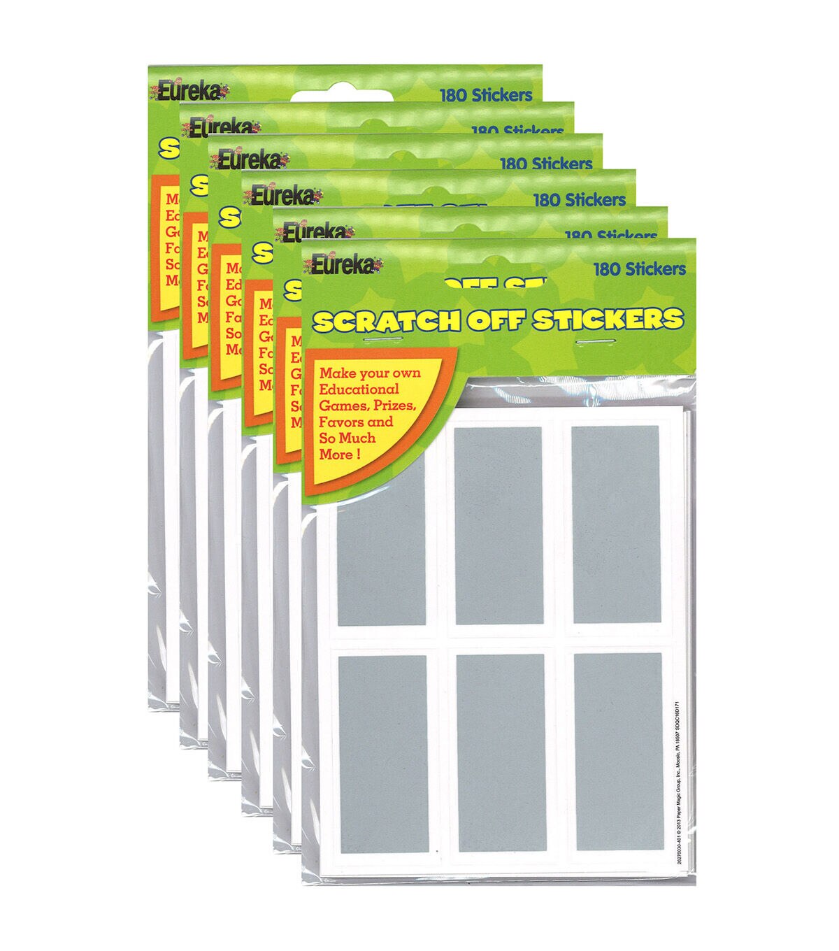 Make your own prizes, games, favors, and more with these Eureka Scratch-Off Stickers. Each sticker measures 2 1/2" x 1". Each pack contains 180 scratch off stickers (30 sheets). Sold as 6 packs for a total of 1080 stickers.