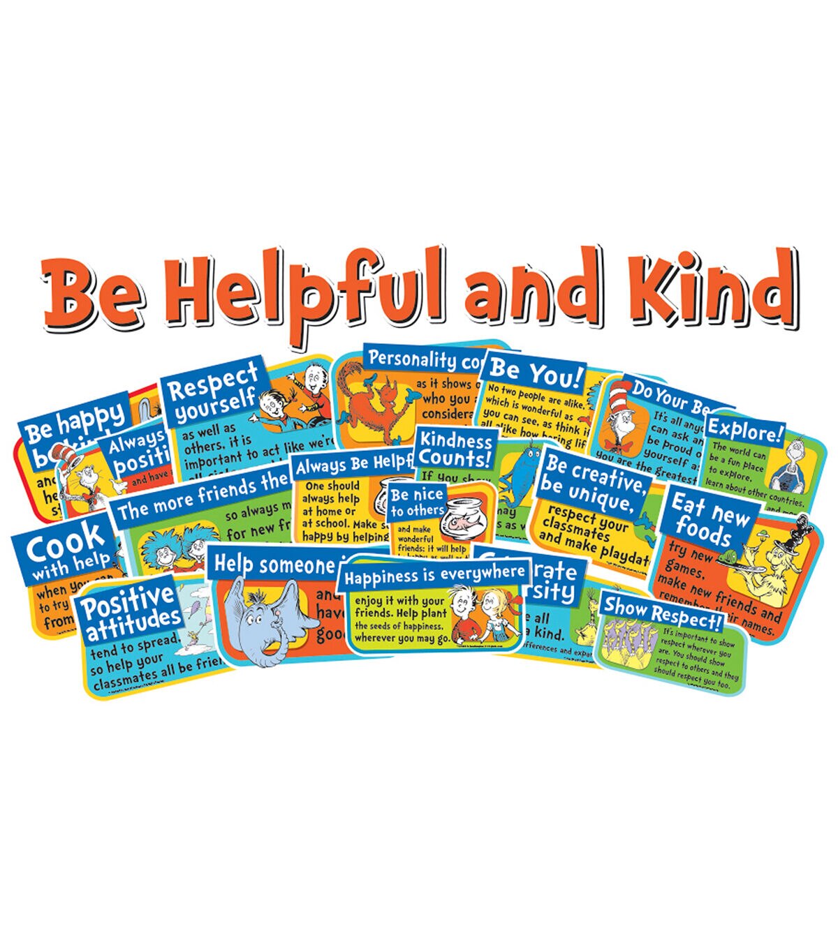 Encourage your students to be kind towards others with this 23 piece Dr. Seuss bulletin board set. Each set includes 4 panels with: 4 piece Be Helpful and Kind Headers and 19 Motivational Cut Outs.