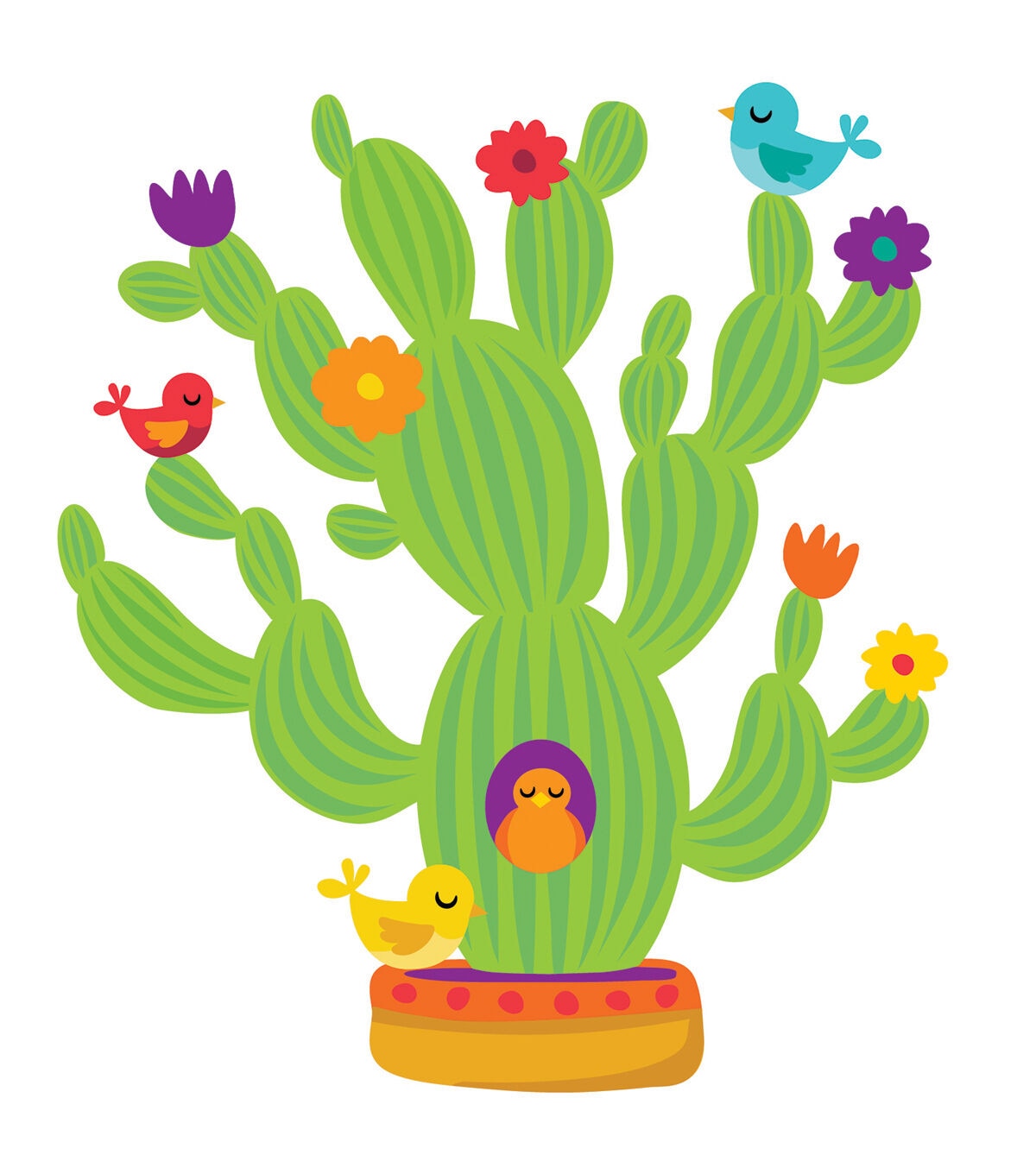 - 26 piece giant cactus approx 4" tall assembled, 4 birds, 6 flowers, 1 pot. Packaged as 4 17" x 24" panels.