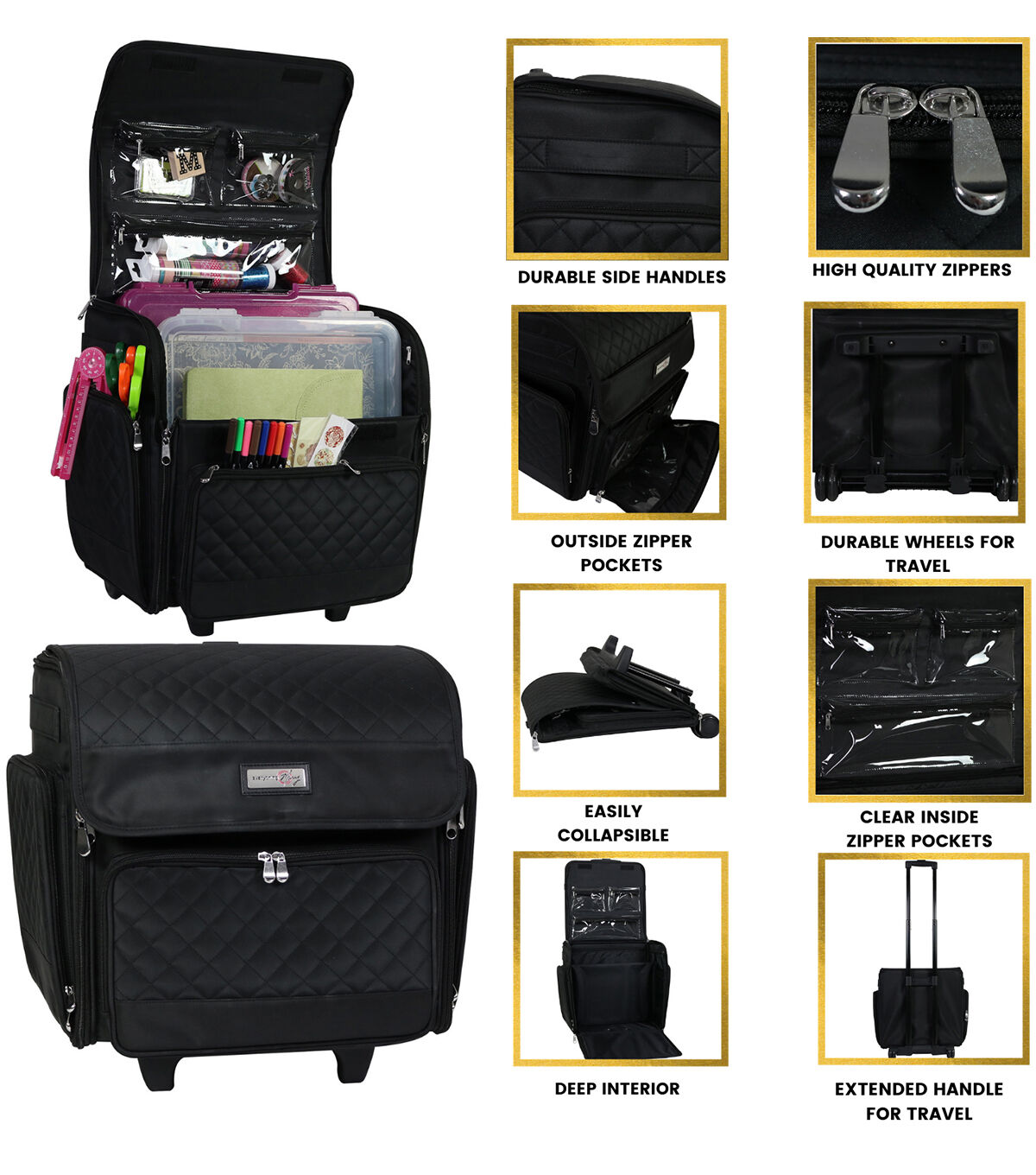 - Spacious Rolling Craft Cart - This rolling travel bag includes 12 storage spaces for Art & Crafts