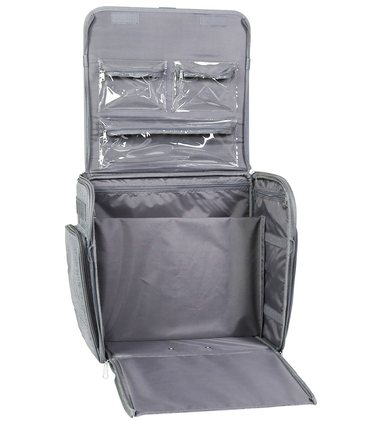 The Everything Mary Deluxe Collapsible Rolling Craft Case is the ultimate storage solution for any storage needs that you may have. This deluxe rolling scrapbook case is constructed from durable polyester and features premium zippers, piping, and an emblem. 44 total storage spaces are built into this deluxe rolling craft case for all your tools, notions, and supplies. These storage spaces include a front zipper pocket, three clear pouches underneath the lid, two front zipper pockets, 30 pen loops, two side pocket dividers, and two compartments inside the tote. The main compartment on this tote organizer is perfect for scrapbooking IRIS boxes, paper, crafts, containers, and so much more! The deluxe rolling tote organizer is fully collapsible. The interior dimensions of this bag are 14.5" L x 9" W x 13.5" H. This tote comes in several elegant and stylish prints. This deluxe scrapbook rolling tote features a telescoping locking handle and a durable wheelset for secure craft storage. Our wheeled craft totes are great for crafting, teachers, medical personnel, or any other storage needs you may have.