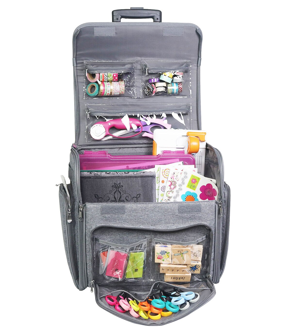 - Spacious Rolling Craft Cart - This rolling travel bag includes 44 total storage spaces for Arts & Crafts, measuring 18.5" x 12" x 18"