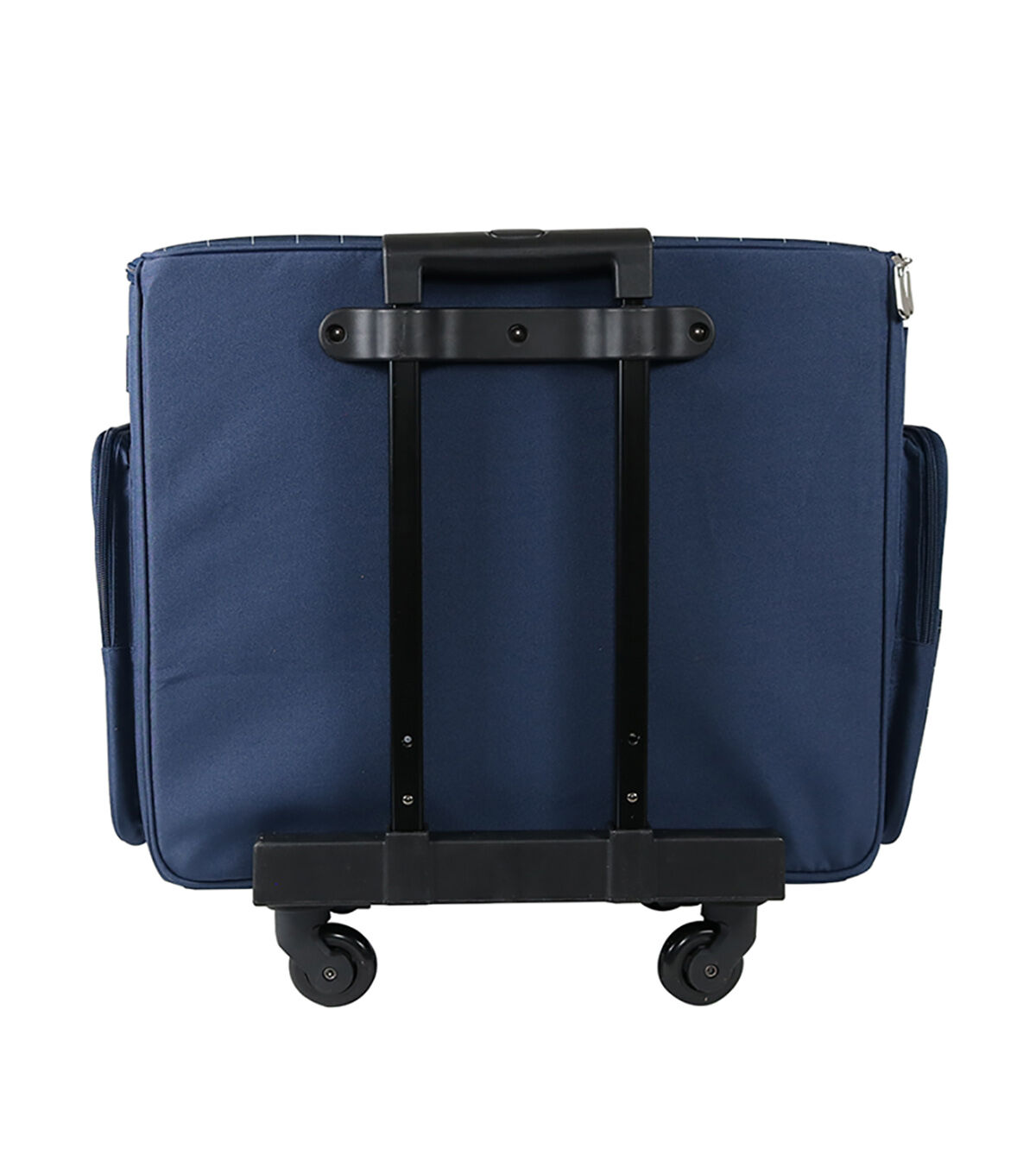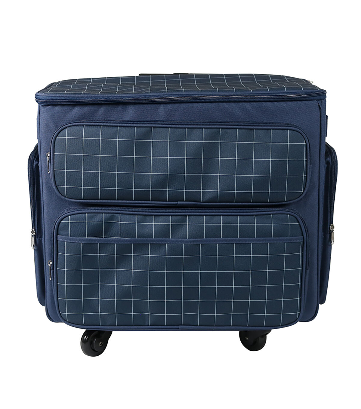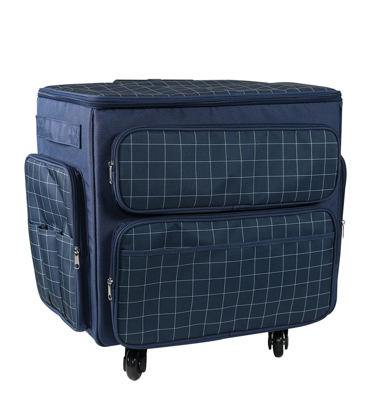 This large XXL rolling tote features multiple storage pockets all around, a locking handle, convenient carry straps, machine strap inside, and is equipped with 4-wheel Quad Rollers. Also features a inside "adustable" divider that includes built in elastic pen holders and 3 zippered clear pockets