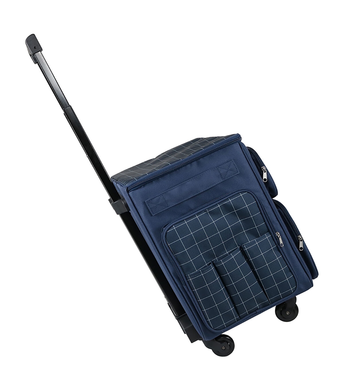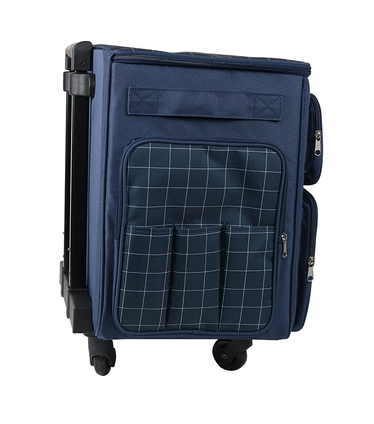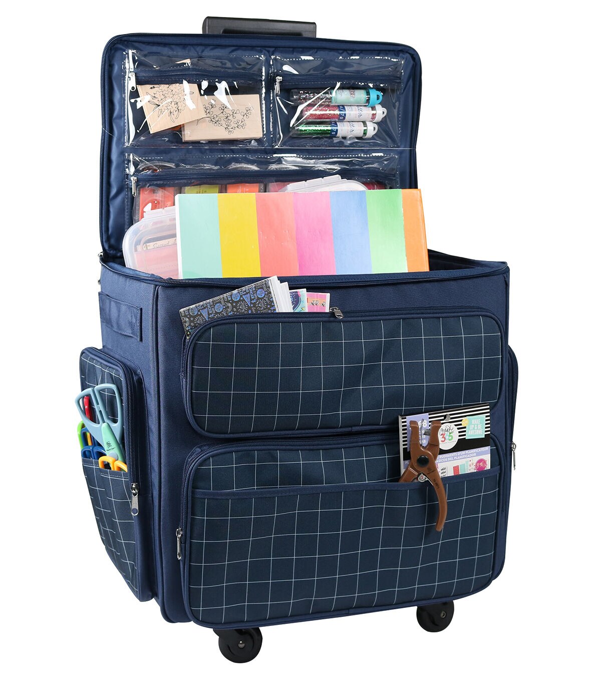 This large XXL rolling tote features multiple storage pockets all around, a locking handle, convenient carry straps, machine strap inside, and is equipped with 4-wheel Quad Rollers. Also features a inside "adustable" divider that includes built in elastic pen holders and 3 zippered clear pockets
