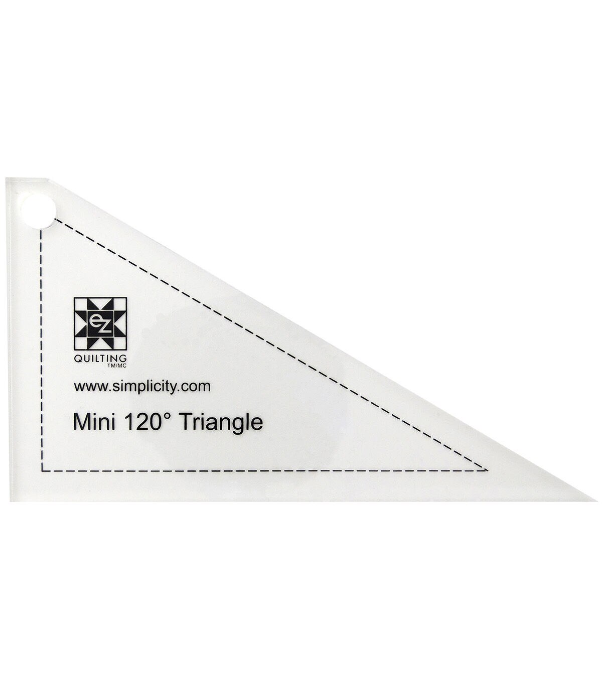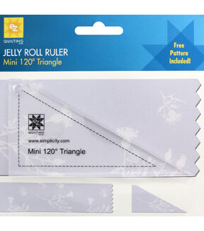Use the wide edge of the Ez Quilting Darlene Zimmerman Mini 120-degree Triangle Jelly Roll Ruler on the fold of a 2.5-inch-wide strip of fabric to cut a long skinny triangle. Three of these will make a 60-degree triangle when sewn together. With an ideal roof shape, this ruler can be used with the 60° Triangle Jelly Roll Ruler to create patterns.