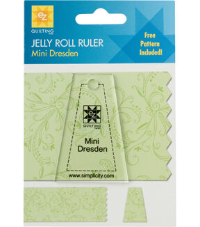 The Ez Quilting Darlene Zimmerman Mini Dresden Jelly Roll Ruler is what you need to rotary cut 2.5-inch wedge shapes from a jelly roll to make a five-bladed fan or a Dresden Plate. It cuts 20 wedges in a 7.5-inch circle or Dresden plate or five wedges to make a 4.5-inch fan block. Each wedge will measure 18 degrees.