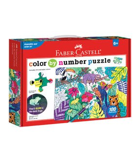 Color, assemble and bring your own DIY coloring puzzle to life! This unique color by number experience allows kids to color, build and piece together a 100-piece jigsaw that has a fun and unique campsite theme. The camping puzzle has 5 surprise reveal, glow in the dark fireflies that when left untouched by the markers will light up a dark room! This kids puzzle also includes resist printing that will reveal surprise designs, such as flowers throughout the campsite, as your child colors in the puzzle. This complete art kit includes 12 Faber-Castell Duo-Tip Markers (24 vibrant colors!), 100 piece colorless puzzle, double-sided color guide, poster of the puzzle design and illustrated instructions to help recreate the coloring on the box or make your own unique jigsaw! All the supplies included in this art project are durable and sturdy to help you create quality results that will provide hours of fun. Coloring, building, and piecing together your own DIY color by number puzzle is beneficial for kids ages 6+! This art project promotes independent play, builds creative confidence, and develops fine motor skills. The Faber-Castell Coloring Puzzle Set is a great screen-free family activity for kids and adults to enjoy together. Great art starts here! Since 1761, Faber-Castell has proudly created art experiences for creatives of all ages to encourage creativity, imagination, and self-expression.