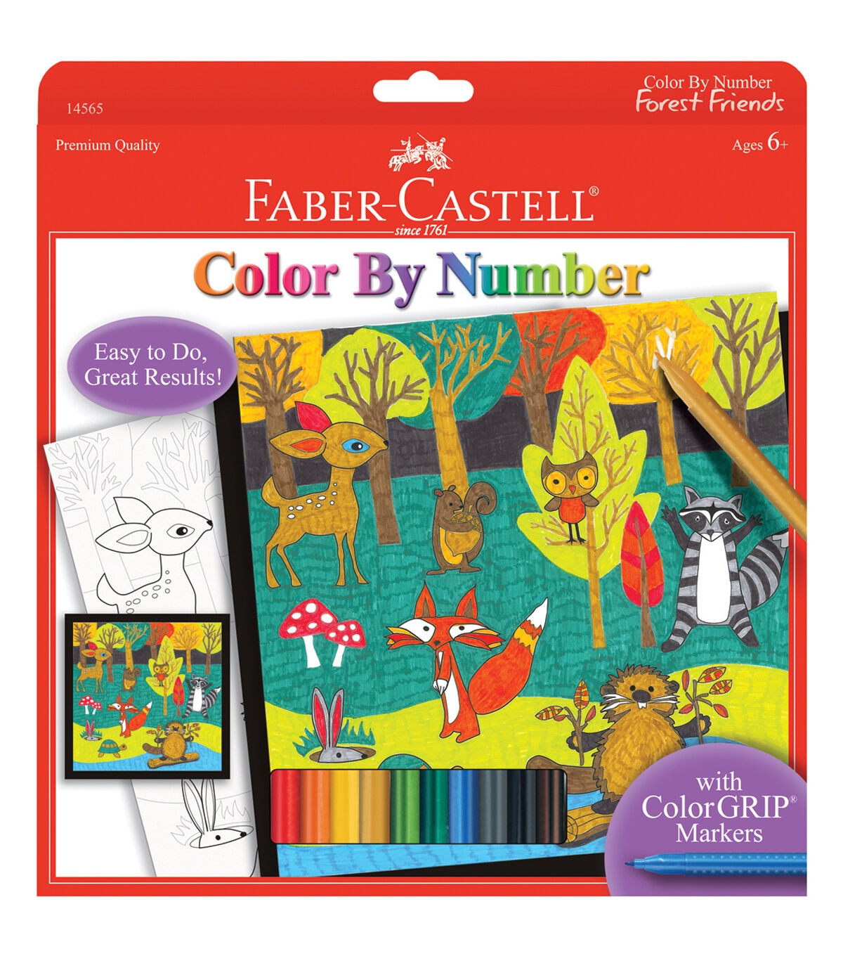 Faber Castell-Color By Number Kit. Learn skills and techniques for coloring with vibrant markers! This package contains ten color Grip markers, one 9x9 inch pre-printed illustration board, one coloring number guide, one 10-1/2x10-1/2 inch foam mounting board and double-sided mounting tape and hangtab. Contents may vary. Recommended for ages 6 and up. Conforms to ASTM D 4236. Non-toxic. Imported.