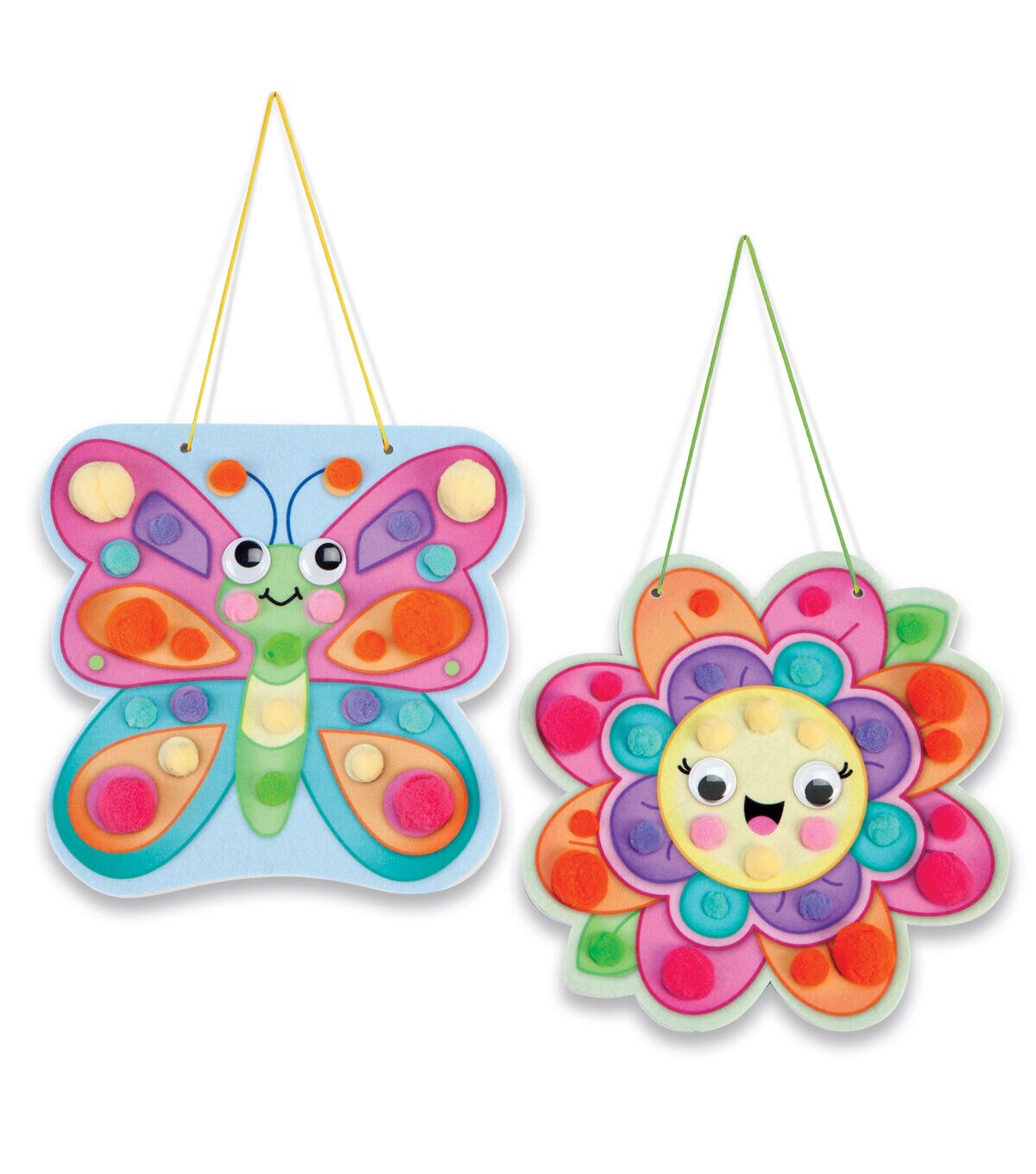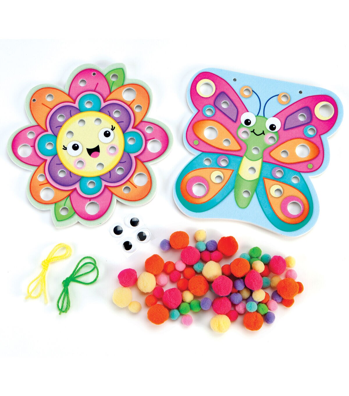 - 2 Foam Boards, Assorted Pom Poms, 2 Hanging Strings, Wiggly Eyes, Storage Bag, Instructions, Contents may vary