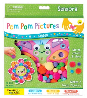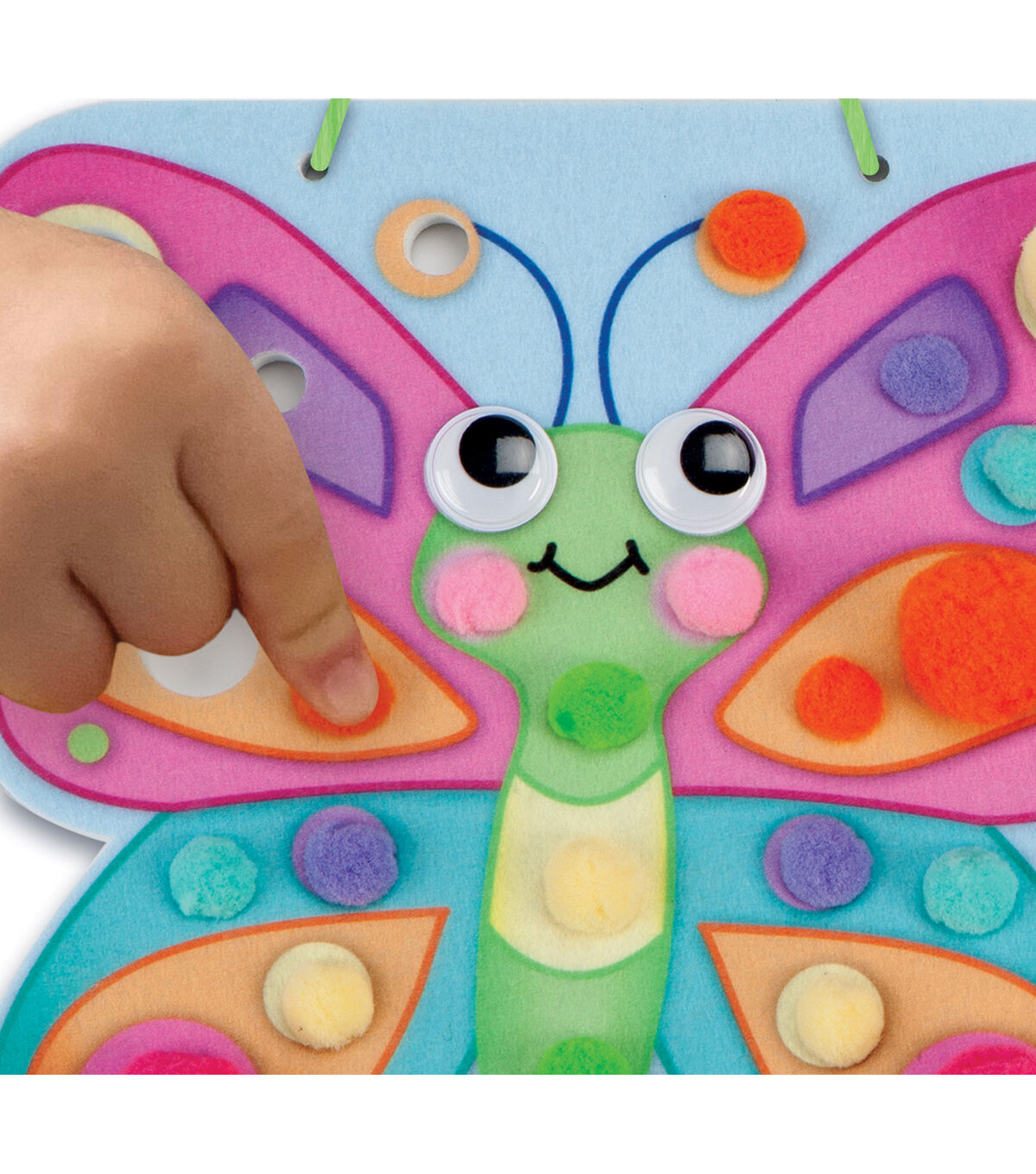 Parents and care-givers will appreciate these no-glue, no-mess “pom pom push” crafts. The perfect sensory activity designed with little fingers in mind. Each kit includes enough materials to create 2 tactile boards. Simply add the self-adhesive wiggly eyes, then push the pom poms into the pre-punched, sturdy felt. To make a new design, just push out the pom poms and start again. This simple craft builds creative confidence and encourages independent, quiet-time play. Zip storage bag makes these great for travel too! Helps develop fine motor skills,color-matching and eye-hand coordination. Proudly display them in your room with the hanging strings provided