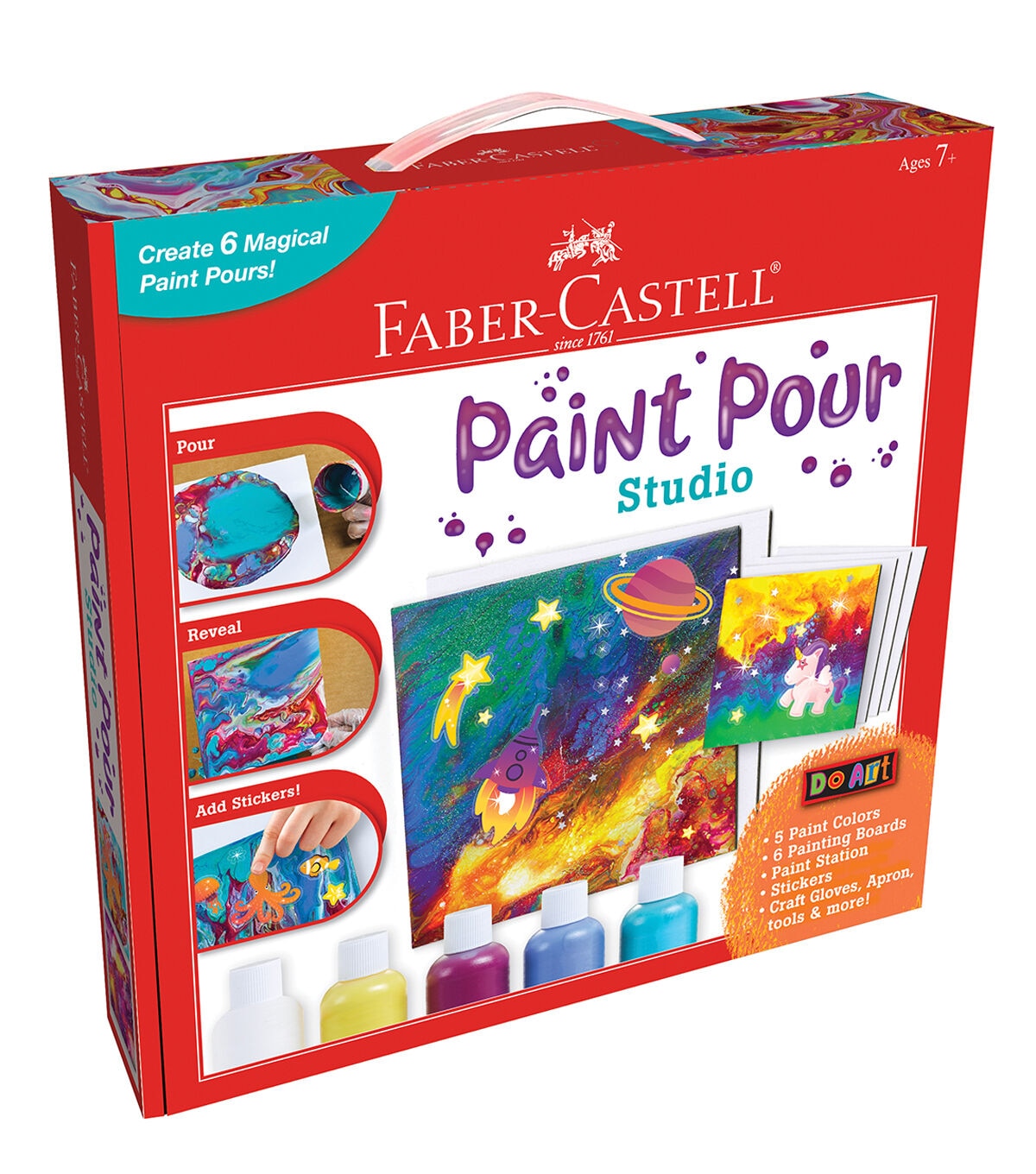 Easy and fun, our child-friendly take on the viral paint pour trend provides everything you need to create 6 amazing paint pour projects. We minimize the mess and maximize the fun by including a painting station, craft apron, disposable cups, gloves, a pipette, straws and more. Watch as the magic cell paint creates interesting patterns and resists. Colorful stickers and glittery accents will add a unique child-friendly finish to your paint pour creations. Fully illustrated instruction guide and 6 painting boards included. Boards measure 3” x 3” (4) and 6” x 6” (2).