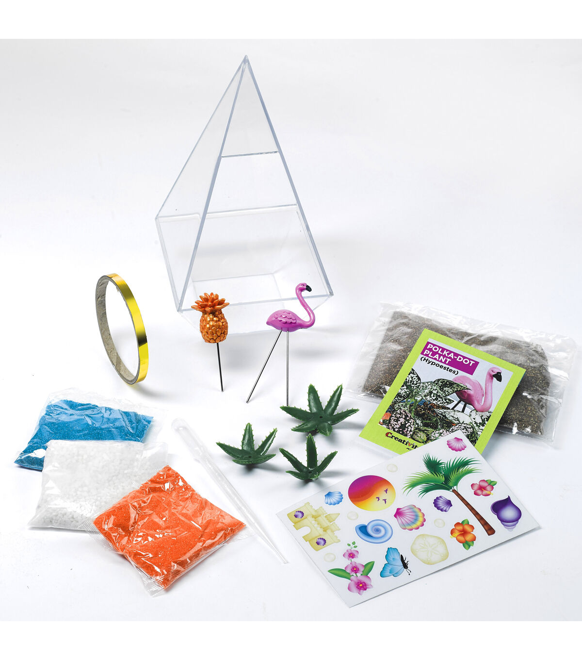 - GARDEN KIT FOR KIDS - Everything you need is included, just add water! This complete DIY craft kit for kids comes with a plastic terrarium, polka-dot plant seeds (Hypoestes), potting mix, a fabulous flamingo, stickers, succulent, and a golden pineapple