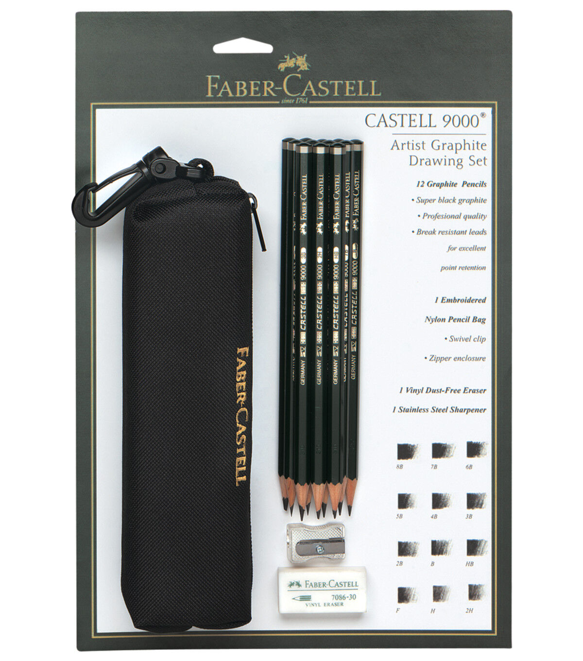 Keep everything you need to sketch organized and easy to transport! This set is made up of high quality pencils and accessories. There are 12 Castell 9000 Pencils, a dust-free vinyl eraser and a stainless steel pencil sharpener all placed in a black nylon pencil bag with a swivel clip and Faber-Castell logo embroidered in gold.