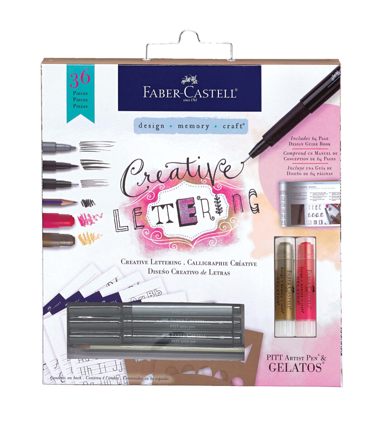 Learn how to make your handwriting more decorative and exciting this Creative Lettering kit! It includes one silver PITT Artist Pen, two black PITT Artist Pens in Bold and Super-Fine, two Gelatos Colors (gold champagne and bubblegum), one graphite pencil (2B), five Lettering Guides, one Envelope Guide, two mixed media stencils, one eraser, one paintbrush and 19 double-sided shapes.