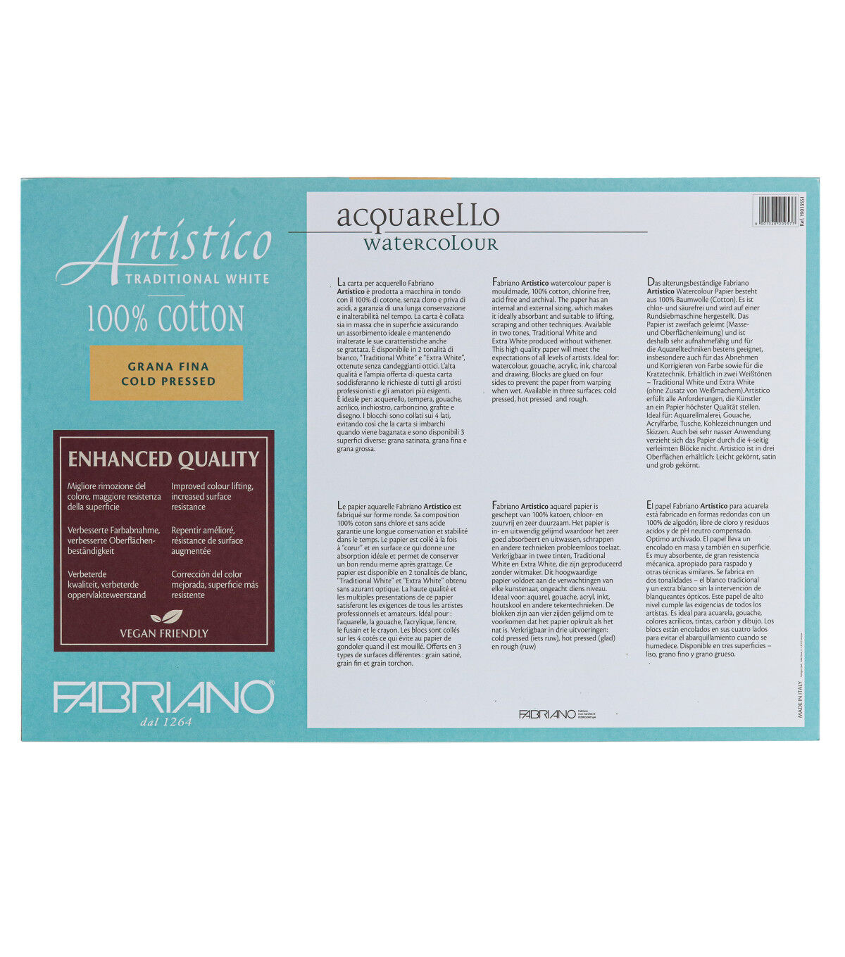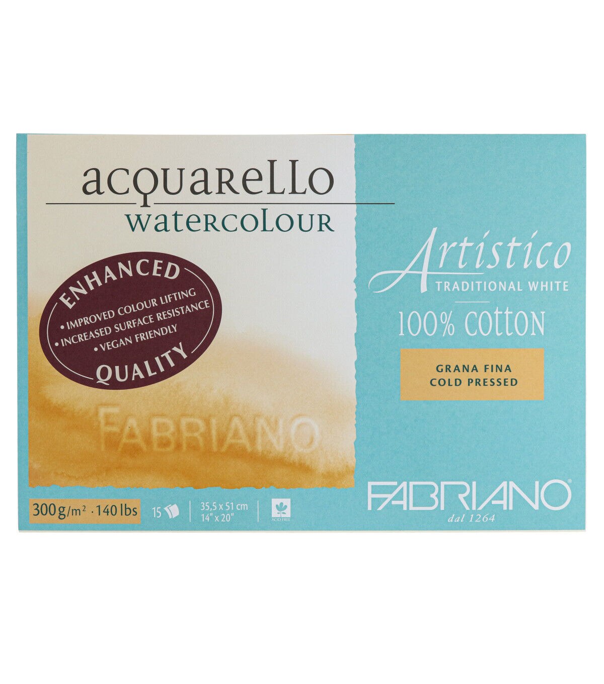 This Fabriano Artistico Watercolor Block is gluebound on all four sides, ideal for painting on the go, outside or without a surface to spread out on. This block features Fabriano Artistico watercolor paper, which ideal for watercolor, tempera, gouache, acrylic, ink, charcoal, graphite and drawing. The paper is sized both internally and externally, making it both absorbent and resilient. This traditional white paper is made without optical brighteners.