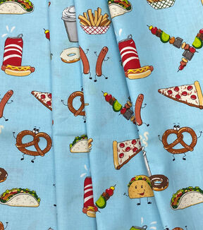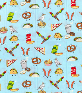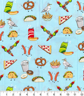 • Fabric Traditions Animated Food on Blue Novelty Cotton Fabric