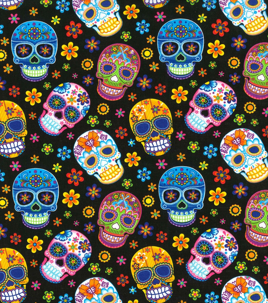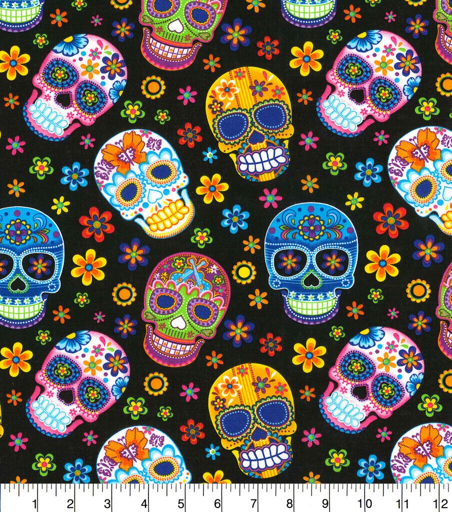 • Fabric Traditions Novelty Cotton Fabric Skulls on Black with Floral