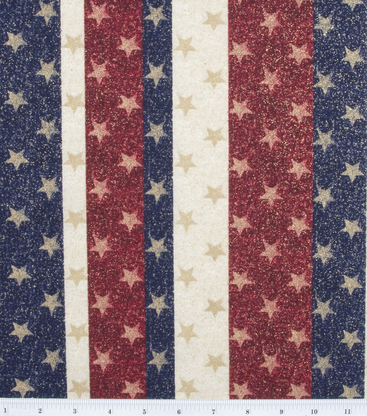 Elevate your patriotic projects with Fabric Traditions Stars on Stripes Patriotic Glitter Cotton Fabric. This beautiful glitter fabric features the colors of the Stars and Stripes, accented by golden stars that give off an iridescent shimmer. Made of 100% cotton and 44 inches wide, this patriotic fabric is perfect for quilts, apparel, and home decor projects. Whether you're creating a quilt to honor a loved one who served or making a festive table runner for your Fourth of July barbecue, this fabric is sure to add a touch of sparkle and patriotism to your project.